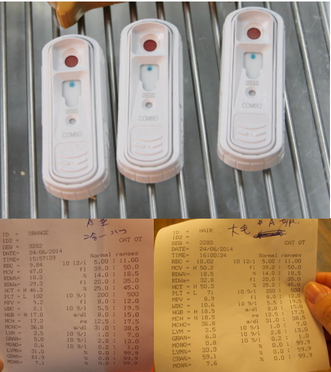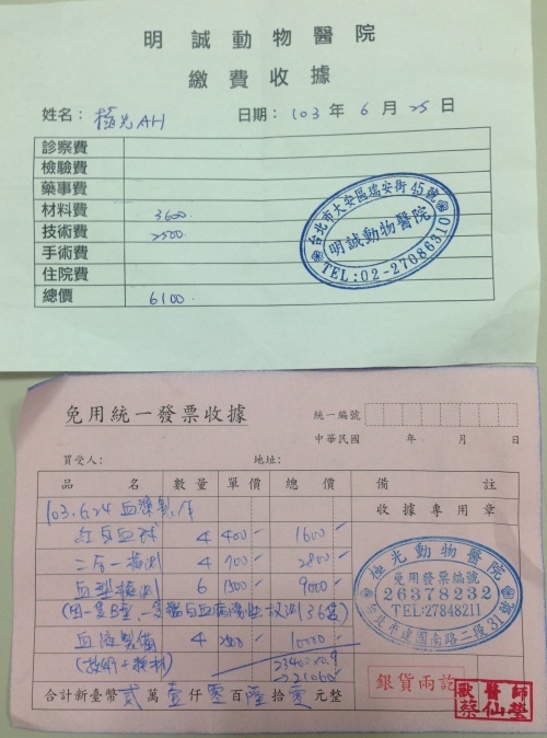 血型檢察6隻*1500=900 (因一隻貓咪驗出血型是B型、一隻驗出貓白血弱陽性不適合製作血漿)