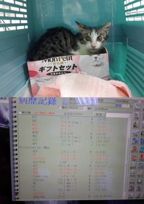 主題: 市場奄奄一息白血小貓 申請者姓名: 陳曉霏 花色: 申請日期: 2014-08-08 06:35:54 申請者部落格: 申請者臉書網址: 所在縣市/合作醫院: 台北市/沐恩動物醫院 治療費用: 20900元 需求人數: 23人 已結案 (2014-11-12 11:48:58) 報名人員: yuki x2(已付款)、Ou Han x2(已付款)、River Chang(已付款)、Hui Chung Shee(已付款)、Ivy、みやびしゅう(已付款)、Vicky Chang(已付款)、陳澤彬 x2(已付款)、小朱(已付款)、Yvonne(已付款)、Shoot Yo(已付款)、徐雅嬪(已付款)、黃小英(已付款)、Tetsu(已付款)、lulumi(已付款)、鍾佳臻 x5(已付款)、泡麵爛了(已付款)、 候補人員: 動物病情說明: 在進行 TNR任務時