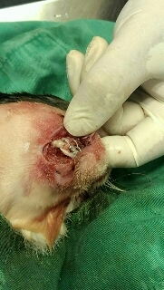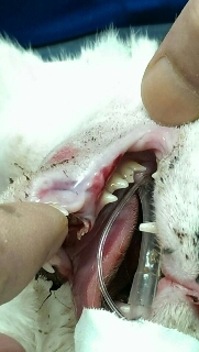 三天後7/21日貓咪情況稍穩定,醫生決定先做下顎骨縫合手術,由於斷裂位子處於咬合密集區,先用兩隻鋼釘索住斷股,修剪突出裂骨。日後下顎如有咬合不整,斷骨錯位時,就必須再開一次,修補突出裂骨。