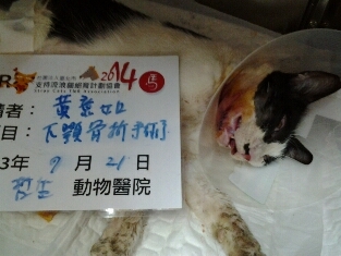 主題: 車禍路倒滿口是血的乳牛貓 申請者姓名: 黃意如 花色: 申請日期: 2014-08-13 21:55:11 申請者部落格: 申請者臉書網址: 所在縣市/合作醫院: 新北市/哲生動物醫院 治療費用: 17000元 需求人數: 19人 已結案 (2014-09-04 10:09:59) 報名人員: 皮皮&米漿貓(已付款)、Patrick x3(已付款)、駱韋仲(已付款)、Yao-Hsien Tseng x2(已付款)、zoo(已付款)、QQ(已付款)、beforn(已付款)、comma6983(已付款)、藍格子 x2(已付款)、Irene(已付款)、Mark Hsu(已付款)、李零子(已付款)、Ai x3(已付款)、 候補人員: 王琮元、米妮米妮、 動物病情說明: 7月18日傍晚突然下起了傾盆大雨,在巷尾轉彎處,發現一隻滿口是血的路倒黑白貓,緊急送醫後,發現下顎斷裂,臉部腫大。照X光後發現還好胸腔沒積血,因為懷疑是車禍撞擊,只能先給于止血和氧氣供應。同時抽血驗血,沒有貧血的現象。同時發現左邊眼框碎裂有滲血現像,下顎骨嚴重斷裂,顱骨局部裂傷。傷勢嚴重!!預計3~5天再麻醉做下顎手術。