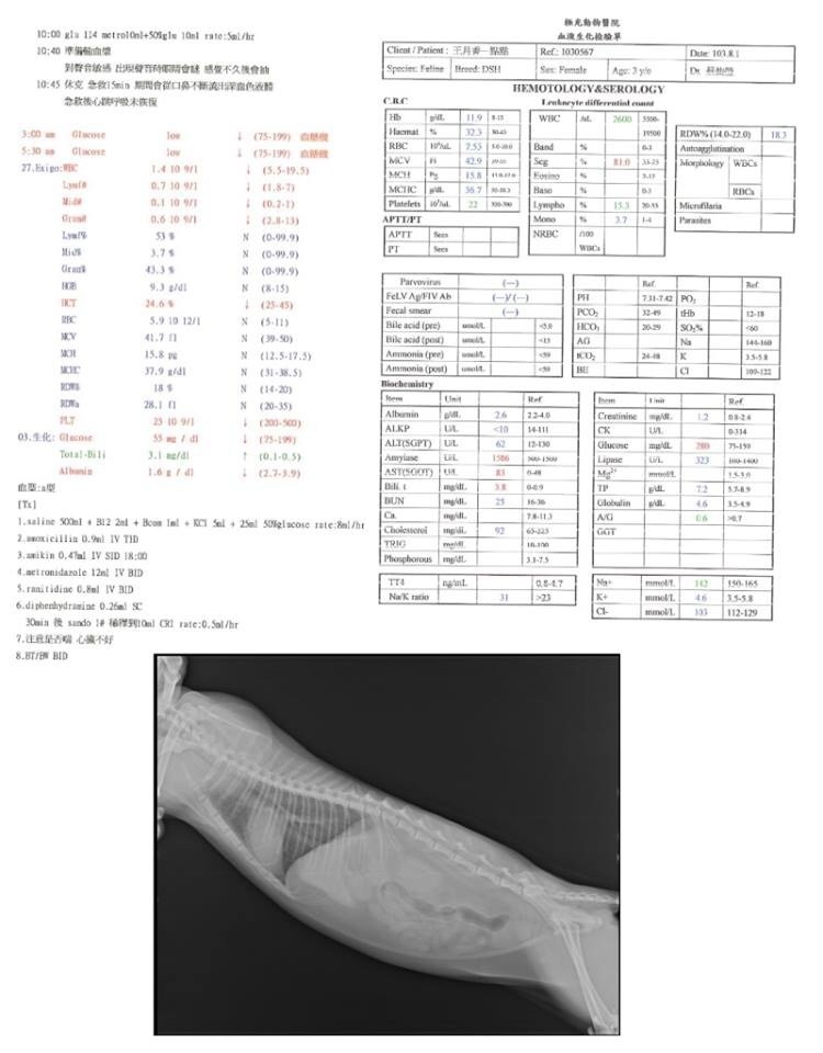 在極光醫院血檢和X光檢查報告顯示:白血球過低(2600)、有黃膽、胰臟炎、心臟肥大、高血糖,且疑似有貓瘟,病情顯然相當嚴重。因有貓瘟之虞,乃轉診長青動物醫院。