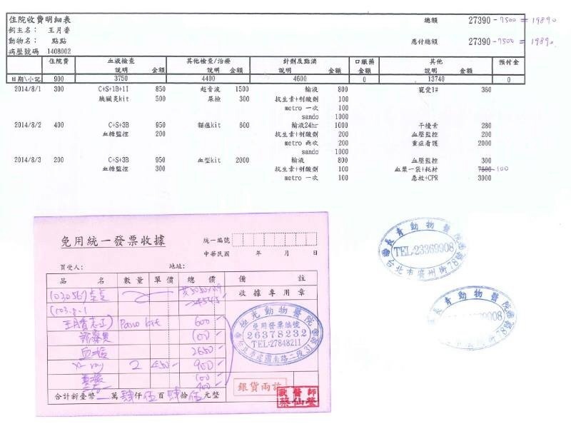 醫療費用極光4545元+長青19890元共24435元(血漿費用扣除7500元是還血漿),懇請大家幫忙,非常感恩。動物近況說明: 三花浪貓-點點的大體,由外雙溪當地愛爸帶回原流浪地土葬,祝福貓咪-點點離苦得樂,往生淨土。