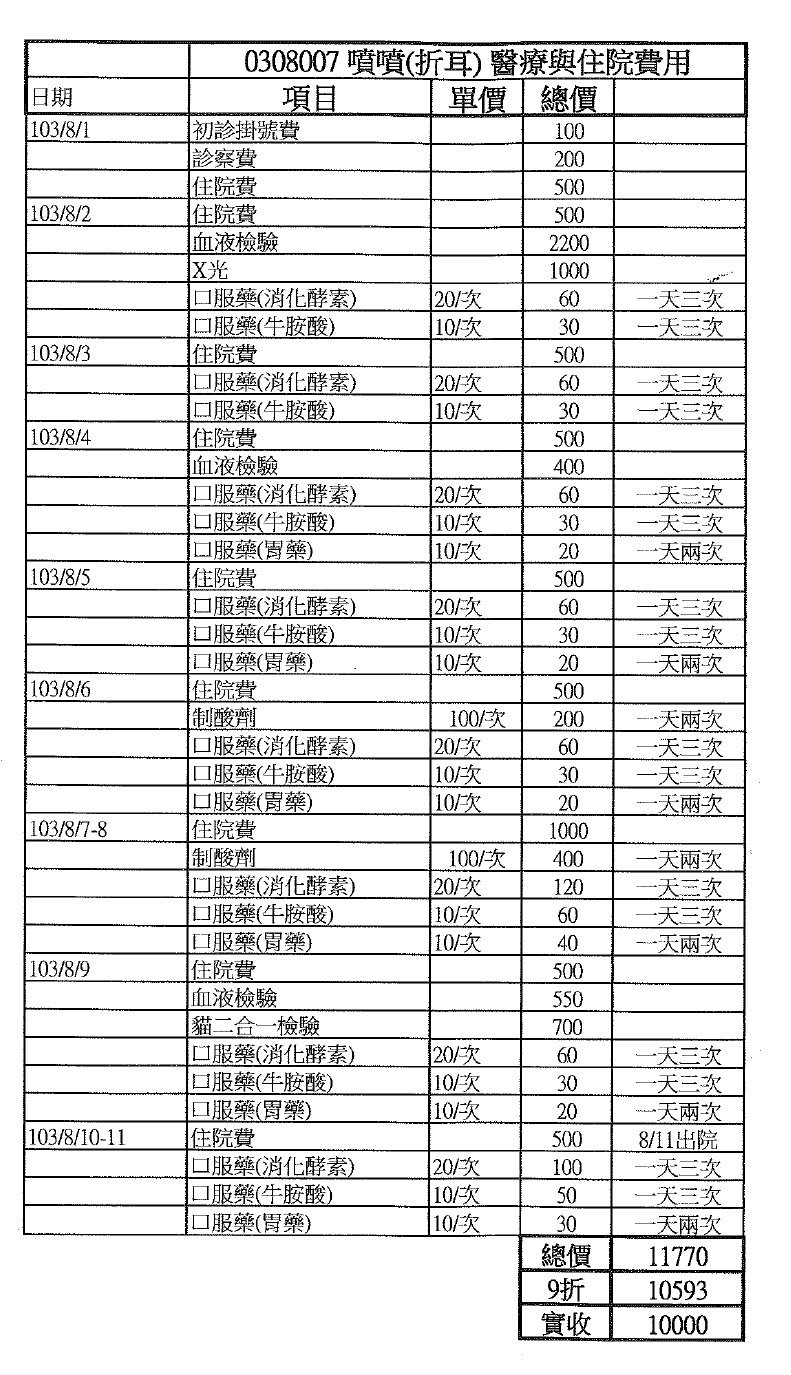主題: 生病被丟棄的摺耳貓 申請者姓名: 陳曉霏 花色: 申請日期: 2014-08-14 19:48:36 申請者部落格: 申請者臉書網址: 所在縣市/合作醫院: 台北市/沐恩動物醫院 治療費用: 10000元 需求人數: 11人 已結案 (2014-09-04 10:06:38) 報名人員: Niki、Patrick x2(已付款)、Limon(已付款)、Ski、Sku、Sku(已付款)、beforn(已付款)、jiun(已付款)、liyinliao x2(已付款)、徐二花(已付款)、拐拐、么么的媽咪(已付款)、JasmineC(已付款)、 候補人員: 西瓜巧比、austin0529、 動物病情說明: 噴噴 是他現在的名子