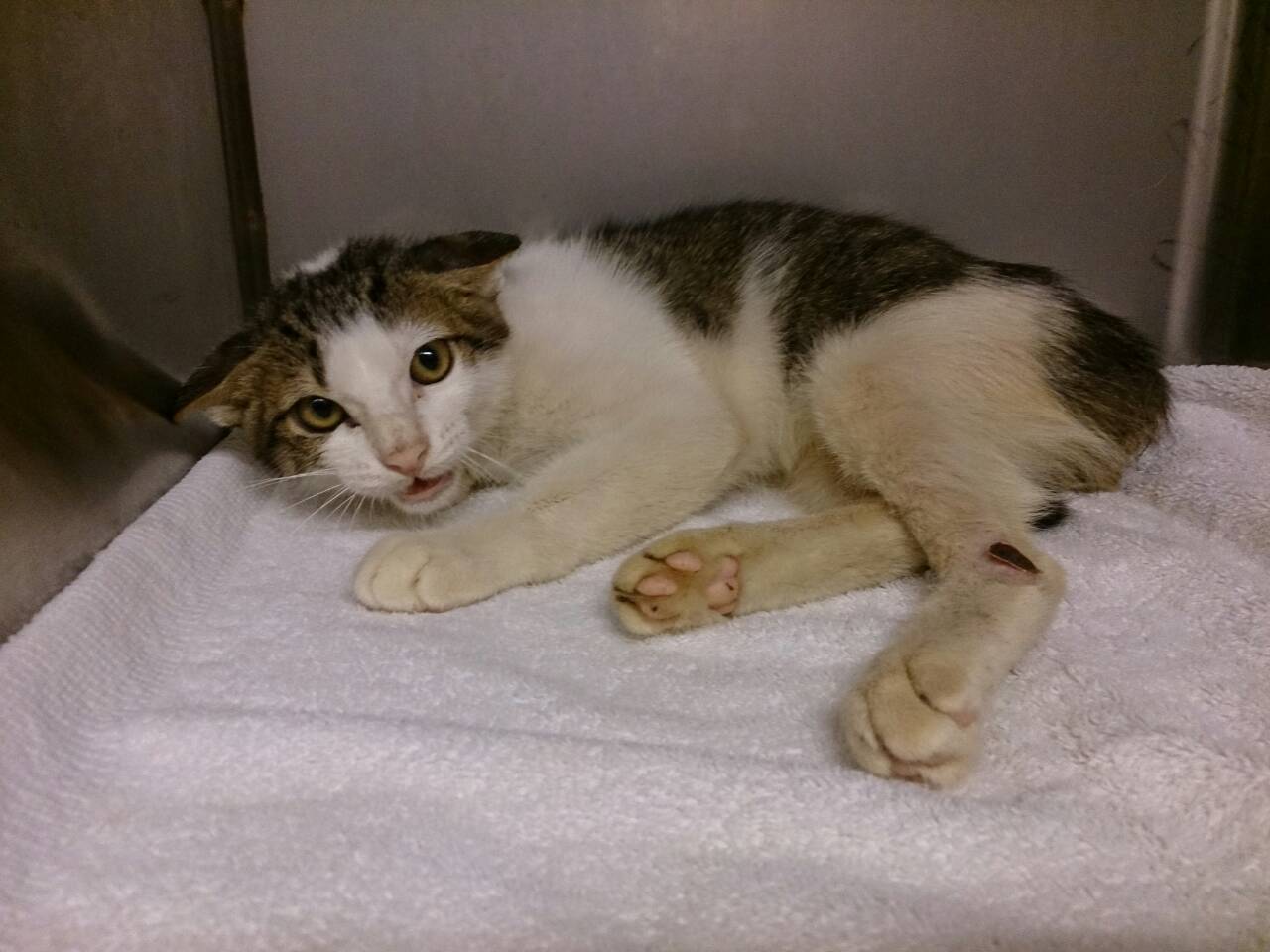 主題: 爬行無法行走的貓 申請者姓名: 劉素鳳 花色: 申請日期: 2014-08-20 21:38:49 申請者部落格: 申請者臉書網址: 所在縣市/合作醫院: 高雄市/弘恩動物醫院 治療費用: 3300元 需求人數: 9人 已結案 (2014-11-12 11:48:18) 報名人員: 林小儀 x2(已付款)、Ni Chen、Ni Chen(已付款)、Ben(已付款)、yoyo(已付款)、點心(已付款)、yuki x2(已付款)、Birdy Yeh(已付款)、 候補人員: 動物病情說明: 在鹽埕區新樂街這邊的路邊看到的貓咪,不知是怎麼了他在路邊爬行,看起來沒什麼外傷懷疑是車禍, 送到醫院 醫生幫他照x光,發現他第三下節腰椎變形 比正常短, 站不起來,觀察後應該除了站不起來癱瘓要擠尿之外沒有其他問題了,會帶他回家安養他,不能再回街頭了,要讓他好好地渡過往後的日子^^
