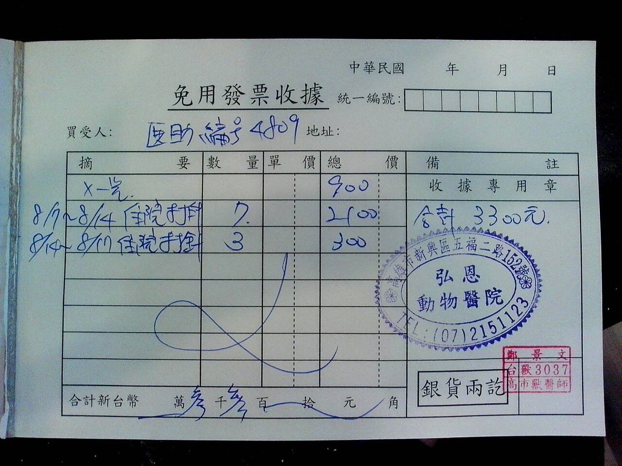 8/14-8/17 住院打針100*3=300(優惠)