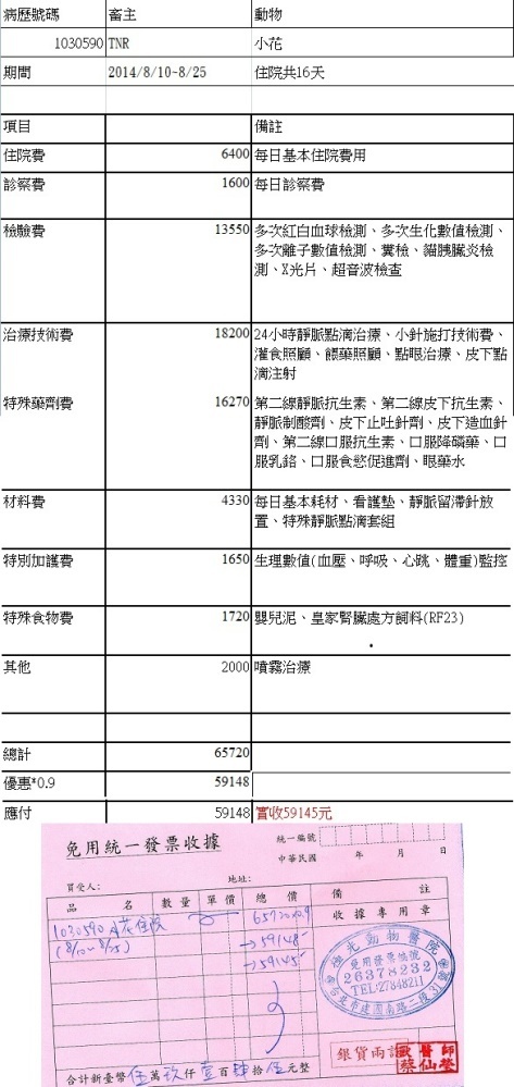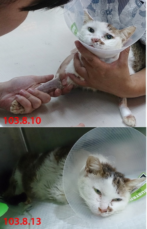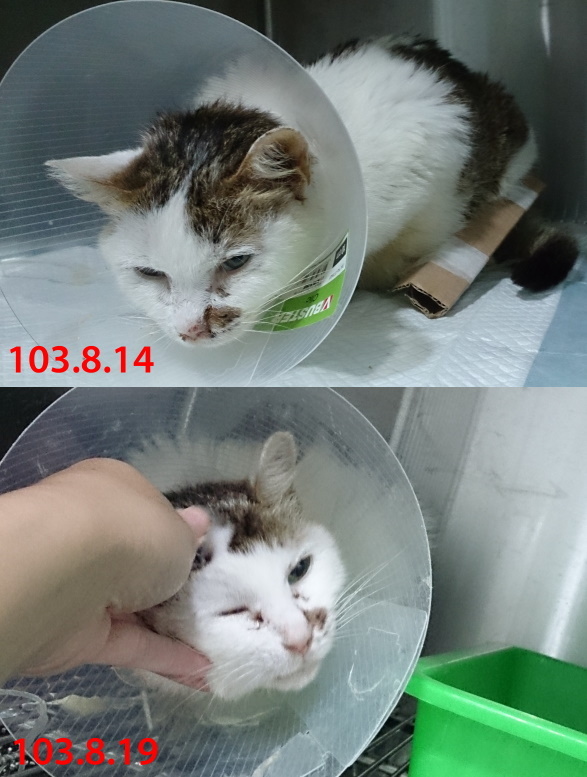 終於在8/19醫生告知小花情況好轉很多且已願自行進食,且各項指數也漸漸恢復到正常值,在8/25出院,由志工帶回照顧每天需打水125cc並打造血針及吃降磷藥和抗生素及類固醇。