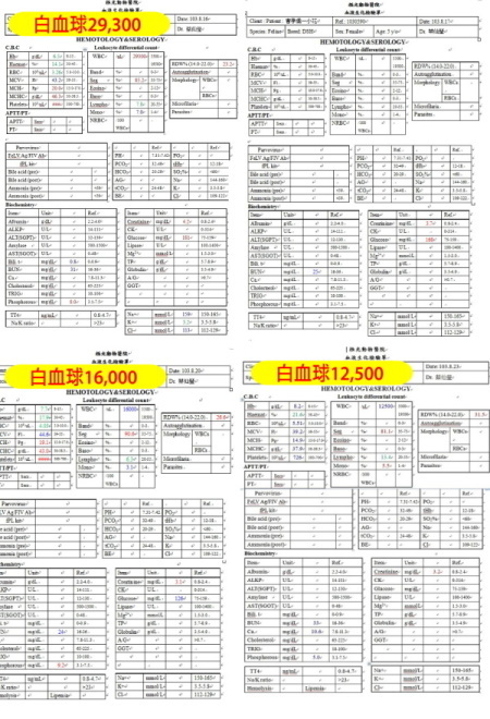 送醫後驗出急性腎衰,點滴給藥3天後因血檢指數較好就幫她拔牙,留院觀察2周後醫生表示情況ok可出院,但出院後不到1周疑因無給點滴的情況,小花開始不吃飯,就又帶回院一驗血白血球又很高,血紅比很低...且有黃疸情況,