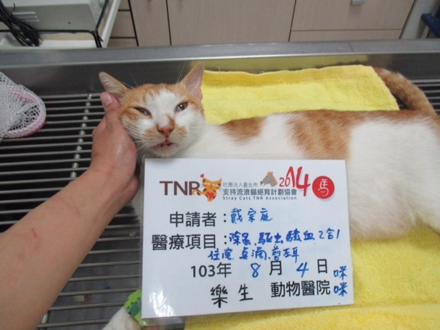 主題: 愛滋橘貓貧血脫水食慾不佳消瘦 申請者姓名: 戴宗庭 花色: 申請日期: 2014-08-16 23:13:57 申請者部落格: 申請者臉書網址: 所在縣市/合作醫院: 高雄市/樂生動物醫院 治療費用: 10700元 需求人數: 12人 已結案 (2014-09-04 10:06:17) 報名人員: wgs(已付款)、Po-Lin Chen(已付款)、蕭紅毛(已付款)、Bonnie Liu x9(已付款)、 候補人員: 動物病情說明: 咪咪是約四年前我在還沒當志工前就帶去結紮的社區浪貓,以前不懂得要替浪貓剪耳,近這一到二星期發現每次餵食浪貓時,咪咪總是不怎麼吃,而且身體日漸消瘦沒有食慾也很沒精神,8月3日當天晚上餵食浪貓時發現他一直趴在地上所以就抓他先回家隔天送醫。醫生初步檢查說咪咪有脫水及食慾不佳需要點滴治療補充營養,眼睛有結膜眼,因身體虛弱需驗血檢查,目前已檢出有愛滋貓及貧血及黃膽。