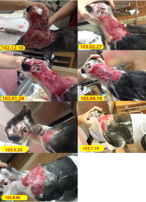 七月份小朋友傷口持平沒有擴大也沒有縮小,太過密集的手術反而會讓皮膚張力擴大,目前是用藻酸鈣敷料幫助皮膚生長慢慢縮口,小朋友後頸背傷口大面積過大,又是活動較頻繁的部位,加上小朋友喜歡抓抓,需要很長的時間,現在先將後腳用紗布綁一個小範圍,讓她沒有辦法抓後頸,希望小朋友可以乖乖配合,讓傷口趕緊癒合。