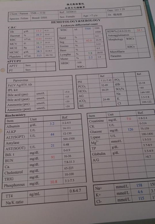 很高興天空小朋友陪我們一周年,從原本瘦巴巴的養的肥滋滋,雖然指數一直不漂亮,最差的時候bun都破百,但連醫師都覺得不可思議的是,僅管指數超標天空還是大吃大喝,體重一直維持在四公斤左右,雖然手術已將癌細胞切除,也完成化療療程,但天空長期使用類固醇改善莫明組織液滲出的問題,使得皮膚肌肉變薄造成疝氣,腎指數也節節高升,以天空的狀況是沒有辦法進行麻醉修疝氣,但這並不會影響天空的生活品質,現在並不強迫進行醫療再他可以接受的範圍打水、EPO,希望天空寶貝可以陪我們很久很久~