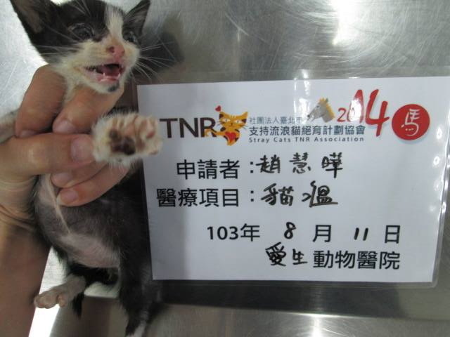 主題: 屏東博愛路又吐又拉貓瘟小貓 申請者姓名: 趙慧曄 花色: 申請日期: 2014-08-25 22:44:34 申請者部落格: 申請者臉書網址: 所在縣市/合作醫院: 屏東縣/愛生動物醫院 治療費用: 3800元 需求人數: 9人 已結案 (2015-02-24 12:29:31) 報名人員: philip x4(已付款)、王嗣皓(已付款)、Yenyu Chen(已付款)、李 其展(已付款)、Ru x2(已付款)、 候補人員: 動物病情說明: 這是屏東志工自博愛路延伸勝利市場新國宅附近正在TNR的區域!!發現一窩小貓~這是其中之一又吐又拉發燒中疑似貓瘟的小小賓士貓!!趕緊送醫院醫療!!怕他度不過病魔的糾纏!!醫師驗血.住院醫療!!希望他平安痊癒出院~~送中途找他醫生的幸福的家~~請大家愛心幫幫他的醫療費用!!謝謝!!! 動物近況說明: 貓瘟已渡過痊癒在中途之家找一生的家!!謝謝~~