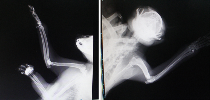 右前臂x光片確認骨頭無傷,多處化膿,應是欲掙脫捕獸夾時弄傷自己。