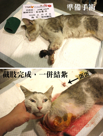 主題: 南寮收容所捕獸夾貓 申請者姓名: Star Wang 花色: 申請日期: 2014-09-09 21:58:14 申請者部落格: 申請者臉書網址: 所在縣市/合作醫院: 新竹市/新竺動物醫院 治療費用: 14000元 需求人數: 16人 已結案 (2014-11-12 11:46:14) 報名人員: 微光(已付款)、Yuii Chou(已付款)、君君(已付款)、Teresa Kao(已付款)、Sonya C(已付款)、Joba Huang(已付款)、Harn Cho(已付款)、cezeil(已付款)、Meng-Chen Tseng x2(已付款)、Janice(已付款)、sandroio(已付款)、Miguel from KJ(已付款)、饅頭阿姨(已付款)、姆姆 x2(已付款)、 候補人員: 動物病情說明: 南寮收容所救援出的捕獸夾貓,