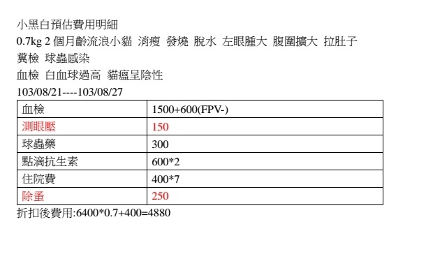 主題: 在路邊隻身吃搜水的眼疾小貓 申請者姓名: 姜雅文 花色: 申請日期: 2014-08-28 22:59:43 申請者部落格: 申請者臉書網址: 所在縣市/合作醫院: 高雄市/恩澤動物醫院 治療費用: 4880元 需求人數: 6人 已結案 (2014-11-12 11:43:48) 報名人員: Nadia Huang(已付款)、張雅筑(已付款)、謝宜宏、謝宜宏、徐雅嬪(已付款)、chris(已付款)、Tiffany Shen(已付款)、ERic YU(已付款)、 候補人員: leelpr、 動物病情說明: 經愛媽拜託,希望能協助捕捉浪貓節育,結果一到現場遠遠就看到這隻小貓一個人在吃餿水,身邊沒有媽媽,結果一靠近眼睛有問題,肚子有點大,送醫治療醫生說有點腹水,眼睛病毒性感染 動物近況說明: 經過治療,眼睛慢慢恢復了,目前要出院回家中途調養,健康之後在開放送養,謝謝各方大德