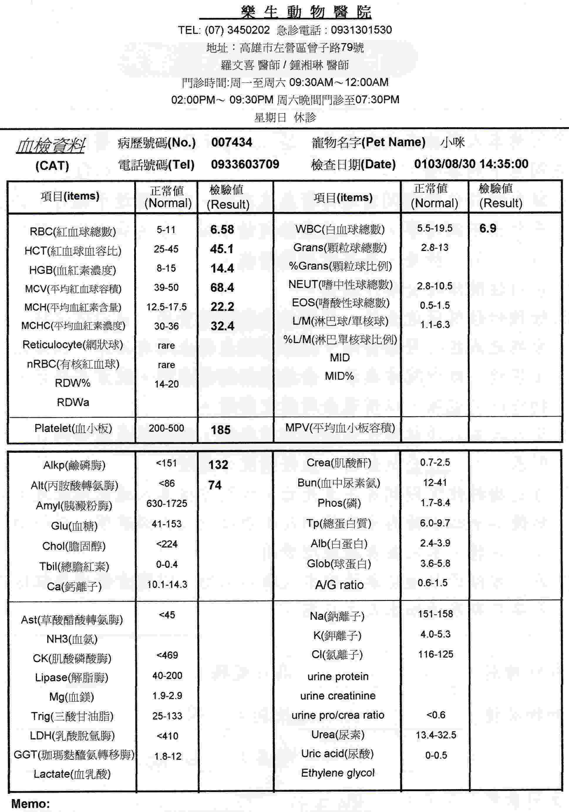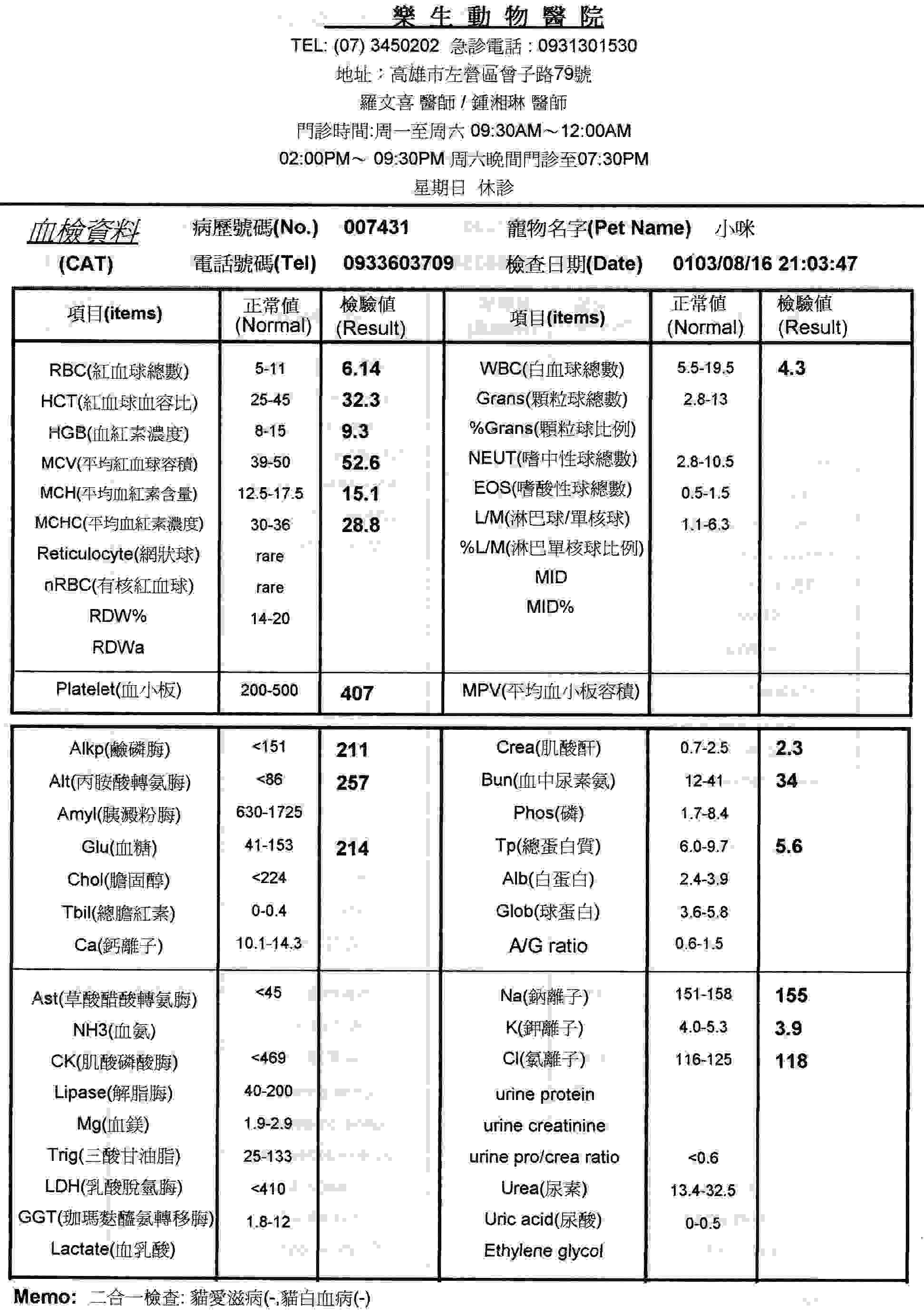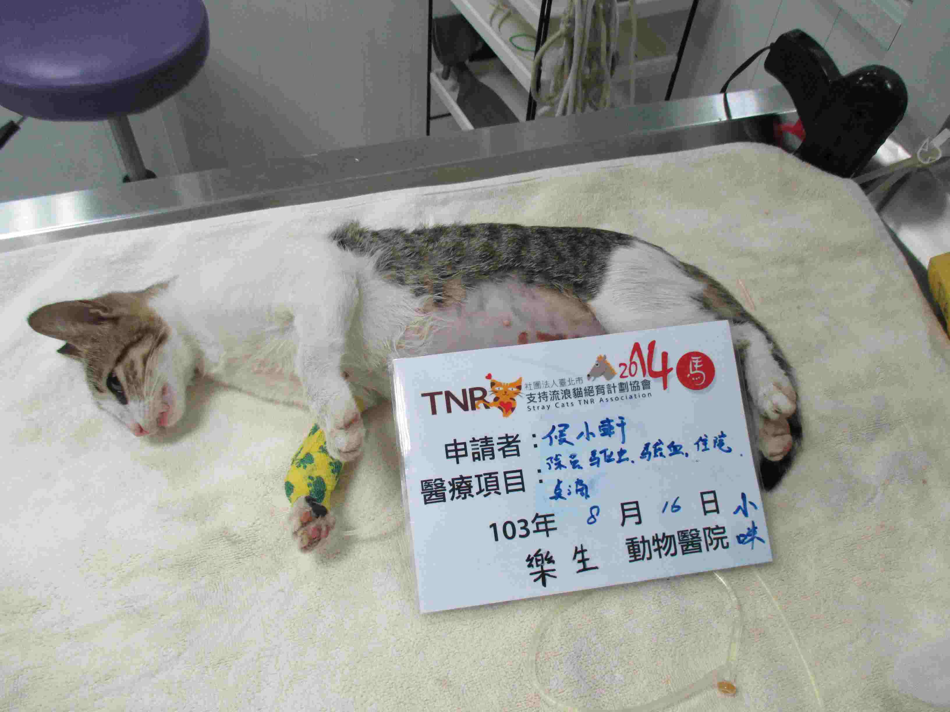 主題: 結紮手術發現有嚴重腹水 申請者姓名: 侯小軒 花色: 申請日期: 2014-09-06 00:26:07 申請者部落格: 申請者臉書網址: 所在縣市/合作醫院: 高雄市/樂生動物醫院 治療費用: 9600元 需求人數: 11人 已結案 (2014-11-12 11:40:17) 報名人員: Hannah Liao(已付款)、Ginelle Qiu(已付款)、yusquare(已付款)、軒圈摳(已付款)、范志瑋(已付款)、Chen Ping(已付款)、蝦(已付款)、Lucida Chen(已付款)、wgs(已付款)、阿屁、阿屁(已付款)、annawu(已付款)、 候補人員: 動物病情說明: 嬌小迷你的小咪!!原本單純想誘捕小咪的媽媽默默去結紮,看著小咪即使吃飽喝足還是一直於現場逗留,始終等不到聰明機靈的默默媽媽,於是與志工戴先生討論決定先將小咪帶至醫院,手術中發現有嚴重腹水,於是做了初步血檢發現有總蛋白及白血球偏低,肝指數過高顯示肝發炎現象,想起小咪進到誘捕籠瞬間,因為害怕緊張不斷用手抓鐵門,即使手指頭因為受傷血流如柱,還是不斷想衝出鐵門,看了非常心疼,希望經由結紮手術而發現肝發炎之小咪,經過點滴藥物治療休養後,可以勇敢堅強不被身體病痛給打敗... 動物近況說明: 小咪8/30第二次抽血檢查肝指數,指數降的非常漂亮,已於9/1健康出院回家休養中途,非常幸運的在9/3由認養人帶回台北享受屬於幸福小咪的每一天!!謝謝樂生羅醫師助理小姐們細心呵護照顧小咪,謝謝社會大眾對小咪醫助支持...