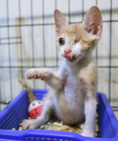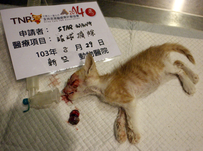 主題: 南寮收容所爆眼小貓Mousy 申請者姓名: Star Wang 花色: 申請日期: 2014-09-22 20:58:08 申請者部落格: 申請者臉書網址: 所在縣市/合作醫院: 新竹市/新竺動物醫院 治療費用: 14000元 需求人數: 16人 已結案 (2014-11-12 11:40:07) 報名人員: 微光(已付款)、Mountain Deng(已付款)、Chili Lin(已付款)、Emily Yen x2(已付款)、Yajun Cat(已付款)、Liz You(已付款)、vivi周(已付款)、邱語蕎(已付款)、橘子(已付款)、Joe Ho(已付款)、25姨 x2(已付款)、艾利歐(已付款)、Alice Tsai(已付款)、小四(已付款)、 候補人員: 動物病情說明: 8/26於南寮收容所接出的爆眼小貓,