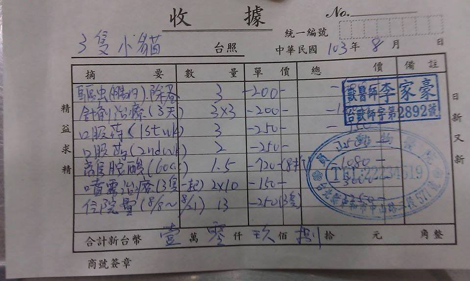主題: 雙溪區鼻氣管炎三小貓 申請者姓名: 臺北市支持流浪貓絕育計劃協會 花色: 申請日期: 2014-09-02 14:05:53 申請者部落格: 申請者臉書網址: 所在縣市/合作醫院: 新北市/員山動物醫院 治療費用: 10980元 需求人數: 13人 已結案 (2014-11-12 11:39:45) 報名人員: Patricia Hsiao(已付款)、Yu Ting Tseng(已付款)、ERic YU(已付款)、nini11071207(已付款)、Vickie(已付款)、潔莎(已付款)、張嘉穎(已付款)、Alice(已付款)、江妮妮(已付款)、Ed Tsai(已付款)、微光(已付款)、范志瑋(已付款)、aika(已付款)、 候補人員: 動物病情說明: 協會接獲民眾通報案件: