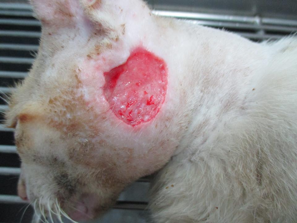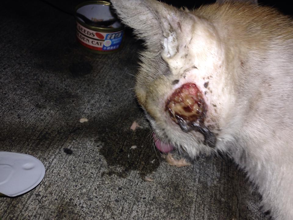 動物近況說明: 剛發現時 傷口處 原是一坨土 以為可能是他在外玩耍弄髒的 結果隔天又來吃飯時 發現那個地方已呈現傷口狀態 紅紅的 又觀察幾天後 發現傷口狀態已經化膿潰爛 決定送醫治療