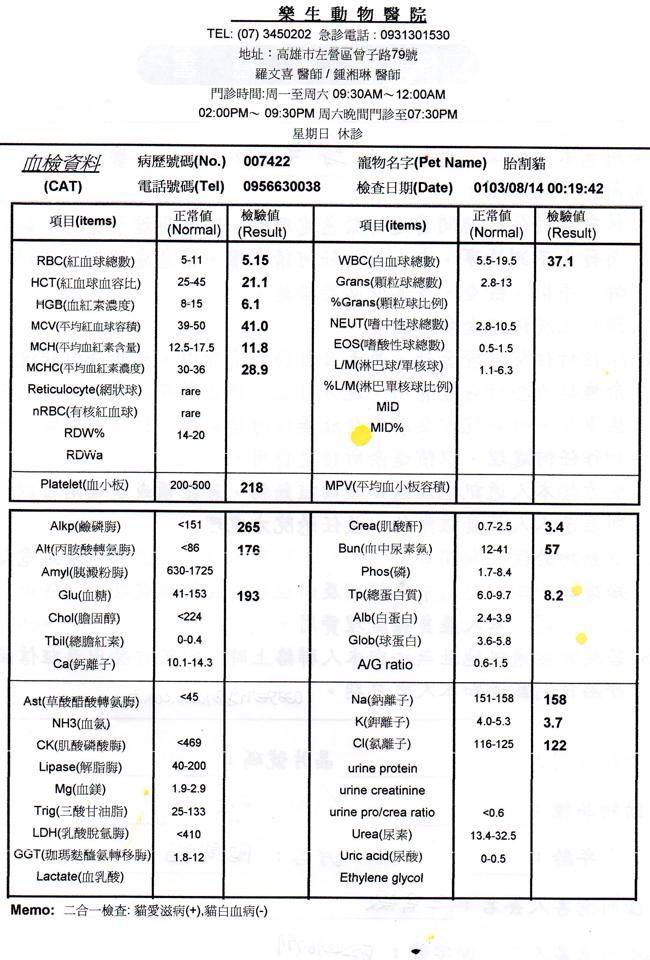他是一隻有愛滋的貓咪 且有嚴重脫水跟貧血的現象 住院時間初步估計是要一個月