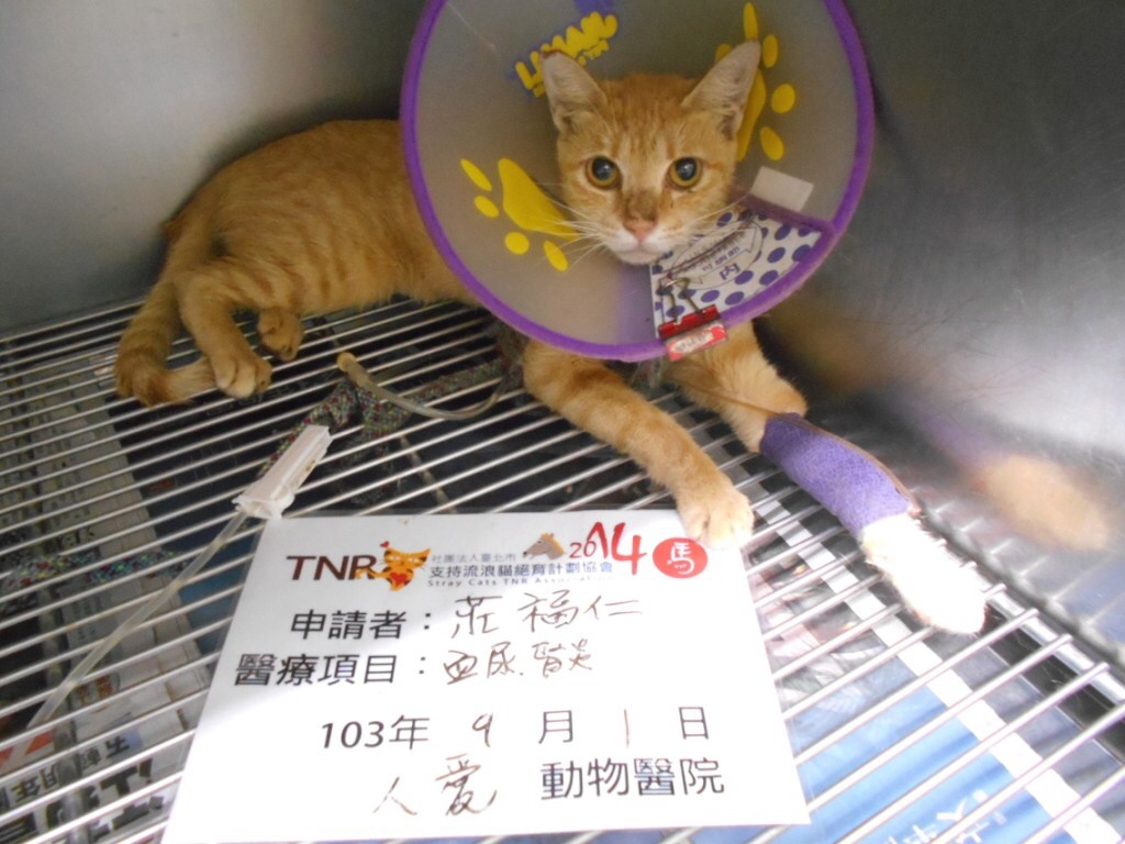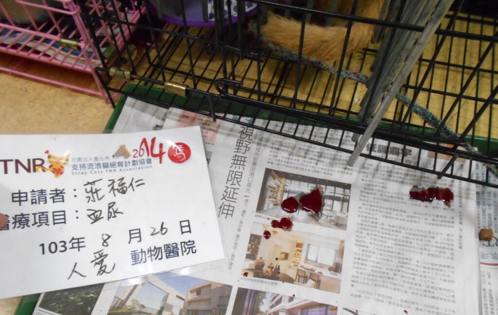 主題: 結紮第二天發現嚴重血尿腎炎 申請者姓名: 莊福仁 花色: 申請日期: 2014-09-09 11:26:02 申請者部落格: 申請者臉書網址: 所在縣市/合作醫院: 高雄市/人愛動物醫院 治療費用: 5580元 需求人數: 7人 已結案 (2014-11-12 11:39:22) 報名人員: 游佳雯 x2(已付款)、范志瑋(已付款)、Jennifer(已付款)、Yun Ting(已付款)、Wang Rachel(已付款)、Phoebe Wu(已付款)、 候補人員: 動物病情說明: 這隻橘母貓於25號誘捕助紮。26號醫院發現籠子底部有血。此橘母貓8月25日至本院助紮,經過一整日之觀察發現為血尿,且血尿滿嚴重,因助紮後貓皆會放置伊莉莎白頸圈導致貓無法將尿道口之血舔掉,因而發現整個尿道口都是鮮血。