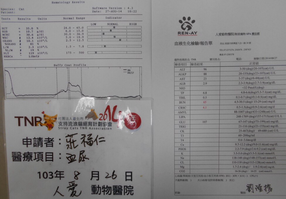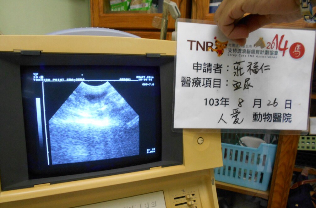 醫生建議需作膀胱尿道超音波檢查及血液檢查了解尿路是否感染及有無結石。在麻醉下給予膀胱超音波結果:膀胱壁增厚,膀胱內有細小之結石。而血檢結果:血小板下降、腎臟功能指數皆飆高,有發炎現象,需給予點滴針劑治療。醫師建議七日治療後再次抽血檢查腎臟功能指數和血尿狀況,以利評估是否適合原放。動物近況說明: 橘母貓在經過抗生素和點滴治療下,血尿狀況有日漸緩和,食慾和精神也有改善,但是有人靠近仍然會緊張。到原放前日,母橘貓解出的尿液顏色漂亮,目前已由志工原放。謝謝大家的幫助,讓這隻本可能出血死於路邊的漂亮母貓 得以延續生命。