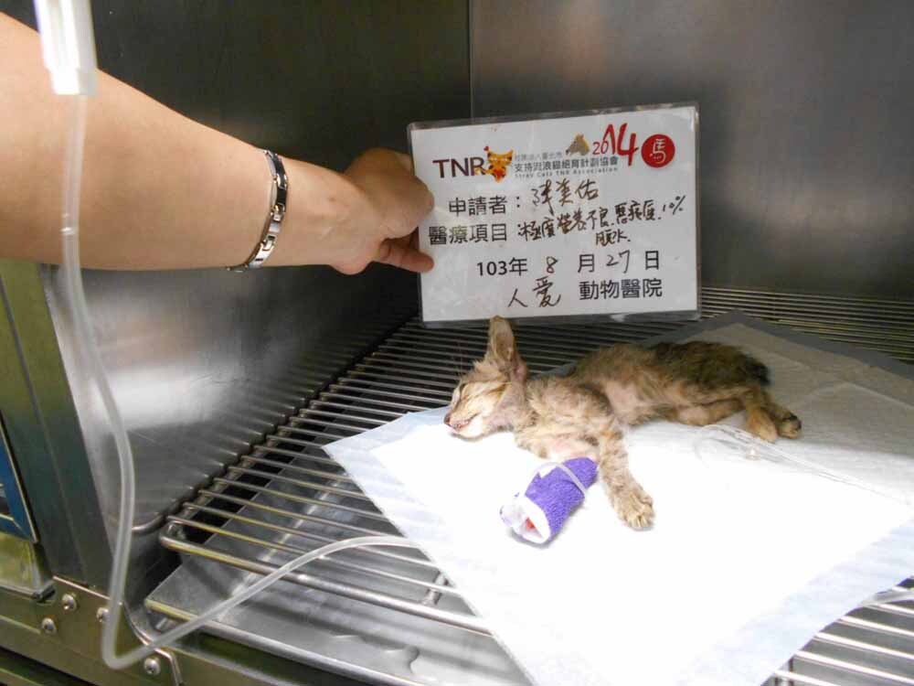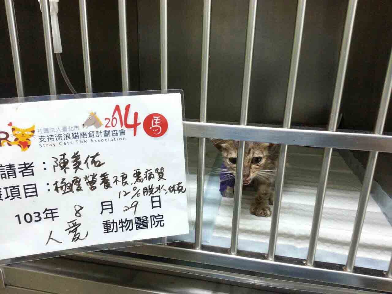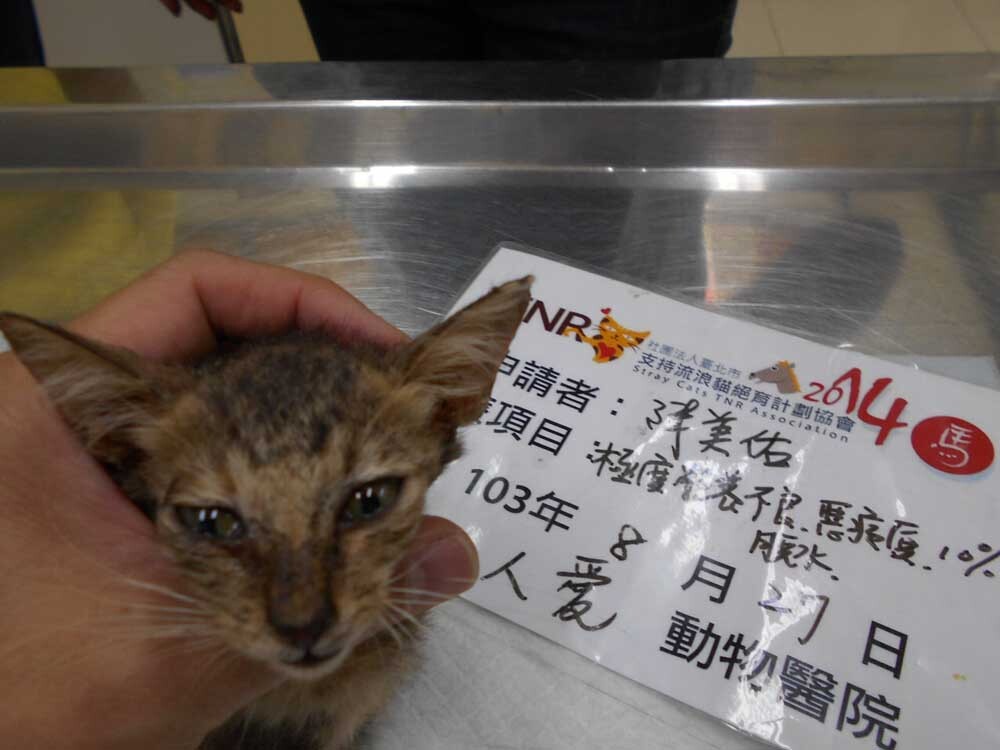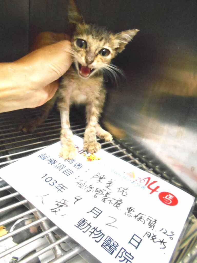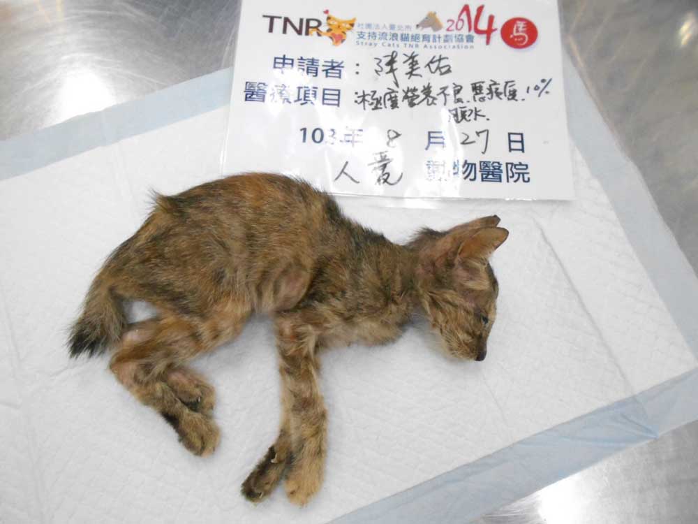 醫生檢查小貓消瘦.低溫.有10~12%脫水現象.快休克.建議需緊急住院點滴及救治療.動物近況說明: TNT附近發現這兩隻小貓,狀況很差,緊急送醫.