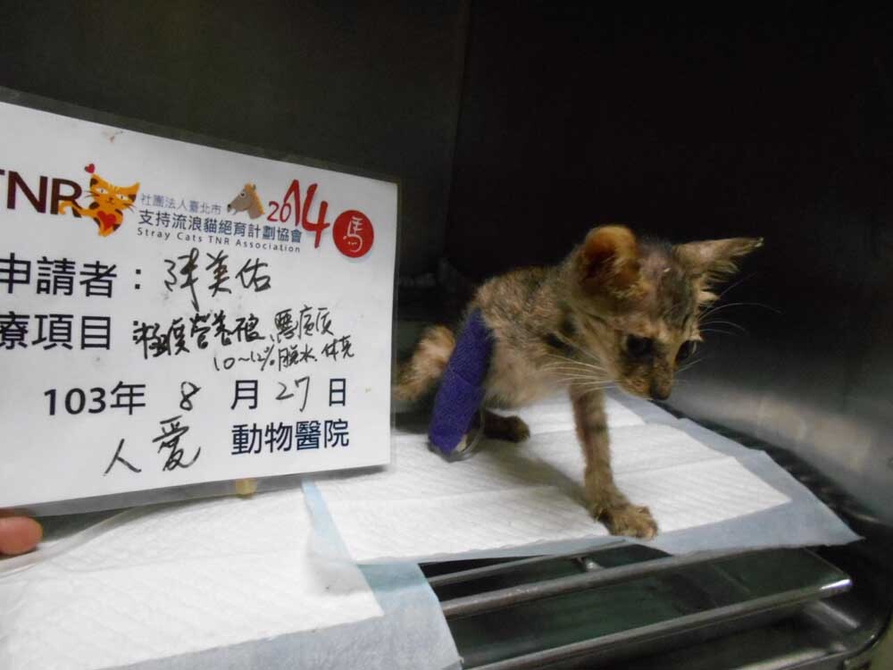 主題: 發現臥倒地上的消瘦虎斑小貓.有失溫現象.緊急送醫 申請者姓名: 陳美佑 花色: 申請日期: 2014-09-10 00:11:59 申請者部落格: 申請者臉書網址: 所在縣市/合作醫院: 高雄市/人愛動物醫院 治療費用: 5490元 需求人數: 7人 已結案 (2014-11-12 11:56:34) 報名人員: zoe(已付款)、蝦(已付款)、保護貓兒與正婷的大叔(已付款)、cutely_irene(已付款)、潔莎(已付款)、翟曼婷(已付款)、annawu(已付款)、 候補人員: 動物病情說明: 發現臥倒地上的消瘦虎斑小貓.有失溫現象.緊急送醫.