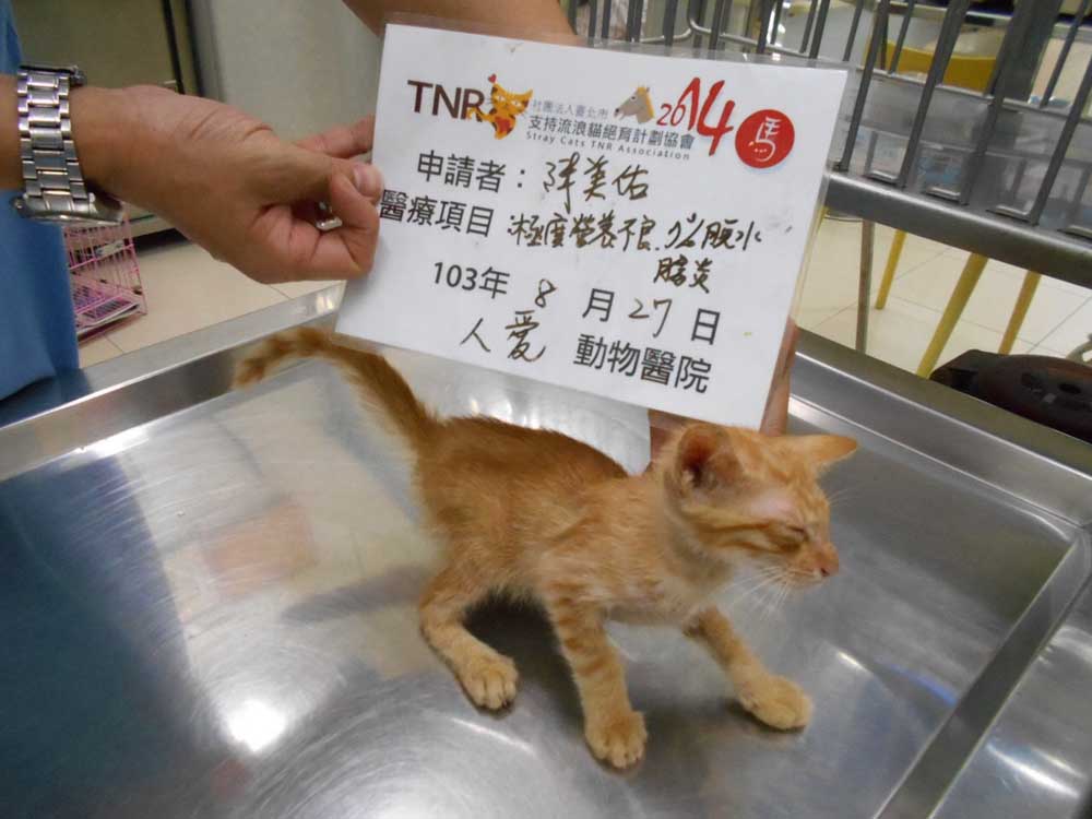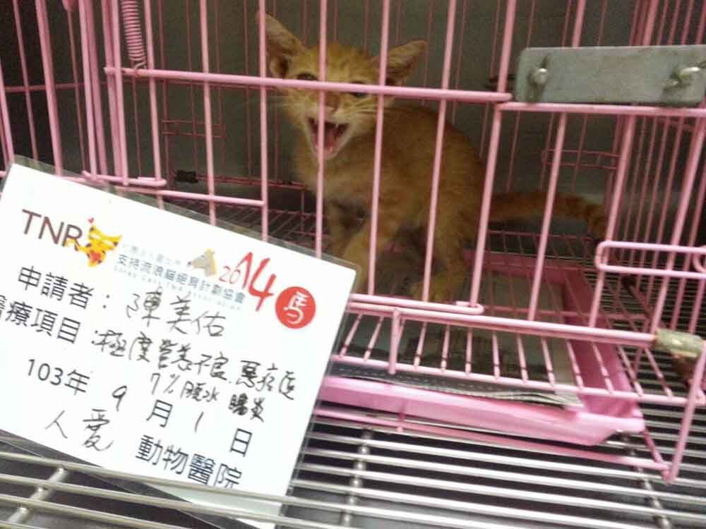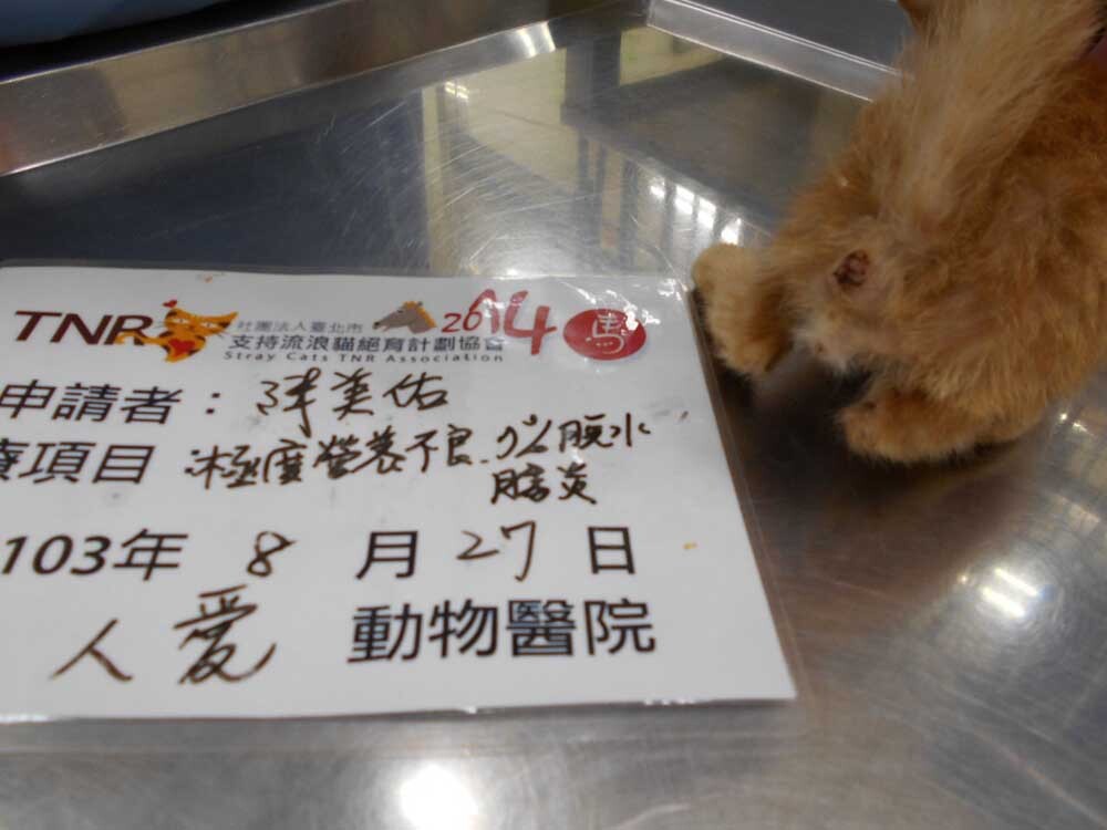主題: 體型消瘦橘黃小貓.窩著顫動.毛有明顯塊狀禿.須就醫 申請者姓名: 陳美佑 花色: 申請日期: 2014-09-10 00:14:33 申請者部落格: 申請者臉書網址: 所在縣市/合作醫院: 高雄市/人愛動物醫院 治療費用: 4275元 需求人數: 11人 已結案 (2014-11-12 11:56:28) 報名人員: Iris Hsu(已付款)、Katze Chen(已付款)、王嗣皓(已付款)、Jokiss Chien(已付款)、Yuchung Liu(已付款)、Yuchung Liu(已付款)、Grace Huang(已付款)、伍伍迪(已付款)、sharonhuang9(已付款)、歪歪(已付款)、MiSty Fang(已付款)、 候補人員: 動物病情說明: 在先發現臥倒虛弱的花虎斑小貓附近,另發現一隻體型也消瘦的橘黃小貓.窩著顫動.毛有明顯塊狀禿毛.須就醫.
