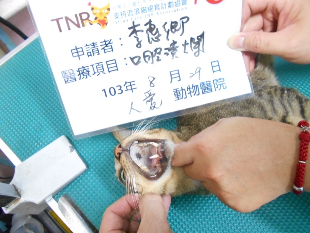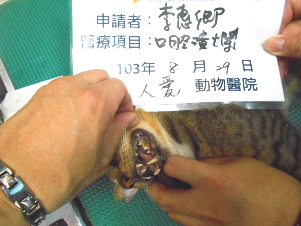 主題: 虎班貓咪口腔嚴重潰爛 申請者姓名: 李惠卿 花色: 申請日期: 2014-09-09 16:41:08 申請者部落格: 申請者臉書網址: 所在縣市/合作醫院: 高雄市/人愛動物醫院 治療費用: 3690元 需求人數: 5人 已結案 (2014-11-12 11:56:12) 報名人員: Joe Ho(已付款)、范志瑋(已付款)、歪歪(已付款)、Summer(已付款)、Amelia(已付款)、 候補人員: 動物病情說明: 帶來醫院原本要結紮~發現嚴重口臭及流膿涎~檢查口腔驚覺口腔爛相當嚴重~懷疑是愛滋病~也擔心口腔炎是細菌感染~至於其他臟器損害情形醫生建議檢查愛滋及血液生化檢查