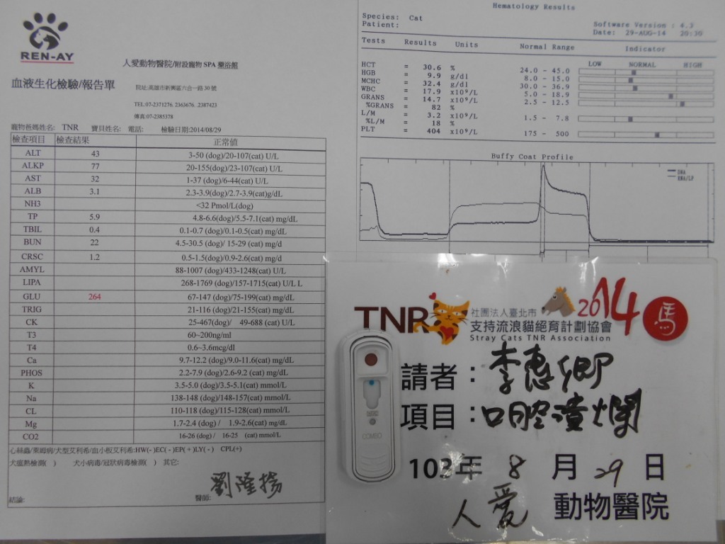 血液生化檢查結果:白血球&血糖較高動物近況說明: 貓咪經一段時間的治療.口腔狀況已 OK .食慾也恢復正常.也已可以大口的吃飯.真好.
