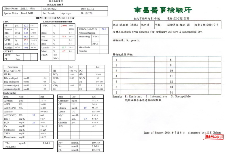 感謝上天憐憫,乖妹的腫塊經化驗並未發現有癌細胞,確認應為縫線過敏所增生的潰瘍肉瘤。