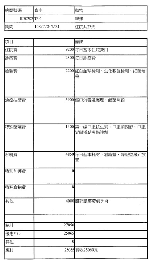主題: 乖妹縫線過敏腫瘤手術 申請者姓名: 詹惠文 花色: 申請日期: 2014-09-10 12:06:34 申請者部落格: 申請者臉書網址: 所在縣市/合作醫院: 台北市/極光動物醫院 治療費用: 25060元 需求人數: 28人 已結案 (2014-11-12 11:56:08) 報名人員: Chunyao Chao(已付款)、范志瑋(已付款)、Cathy Lu(已付款)、QQ(已付款)、Even Chen(已付款)、劉玉婷(已付款)、MeowMeow Jia(已付款)、Leah(已付款)、Shizuka Ho(已付款)、林佩儀(已付款)、馬德楊(已付款)、vicky、FS.NG(已付款)、李凱特(已付款)、ste7396(已付款)、Lacey Lai(已付款)、Daisy Lu(已付款)、阿貝(已付款)、Summer(已付款)、yvonne(已付款)、Pinger x8(已付款)、Becca Huang(已付款)、 候補人員: 動物病情說明: 乖妹是今年2月底出嚴重車禍,性命垂危致後肢癱瘓的TNR浪貓。