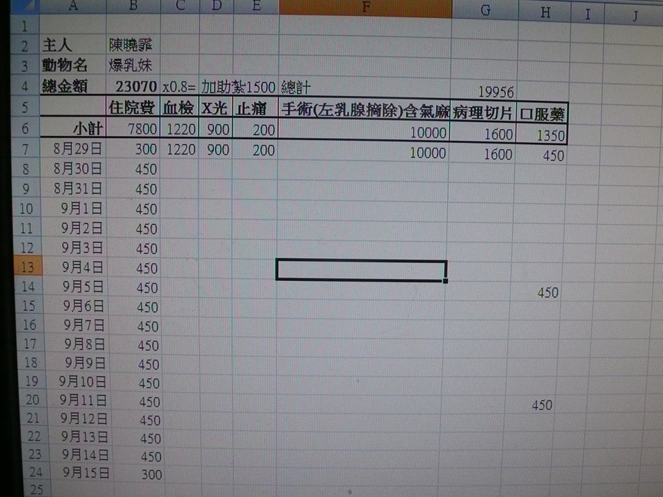 主題: 乳頭破一個大洞 申請者姓名: 陳曉霏 花色: 申請日期: 2014-10-23 03:52:53 申請者部落格: 申請者臉書網址: 所在縣市/合作醫院: 台北市/長沁動物醫院 治療費用: 19956元 需求人數: 23人 已結案 (2014-11-12 11:55:52) 報名人員: Sa Hsu(已付款)、悅萱 x3(已付款)、Jelly Lee(已付款)、米雪路(已付款)、ARu Lin(已付款)、Rocky Chen x3(已付款)、Dahany(已付款)、Salome Chang(已付款)、vivian(已付款)、小黃(已付款)、肥仔(已付款)、Momo Liao x2(已付款)、FS.NG(已付款)、莊珍妮 x2(已付款)、Bubu Dai x2(已付款)、Larisa Lee(已付款)、 候補人員: 動物病情說明: 親人的三花媽媽