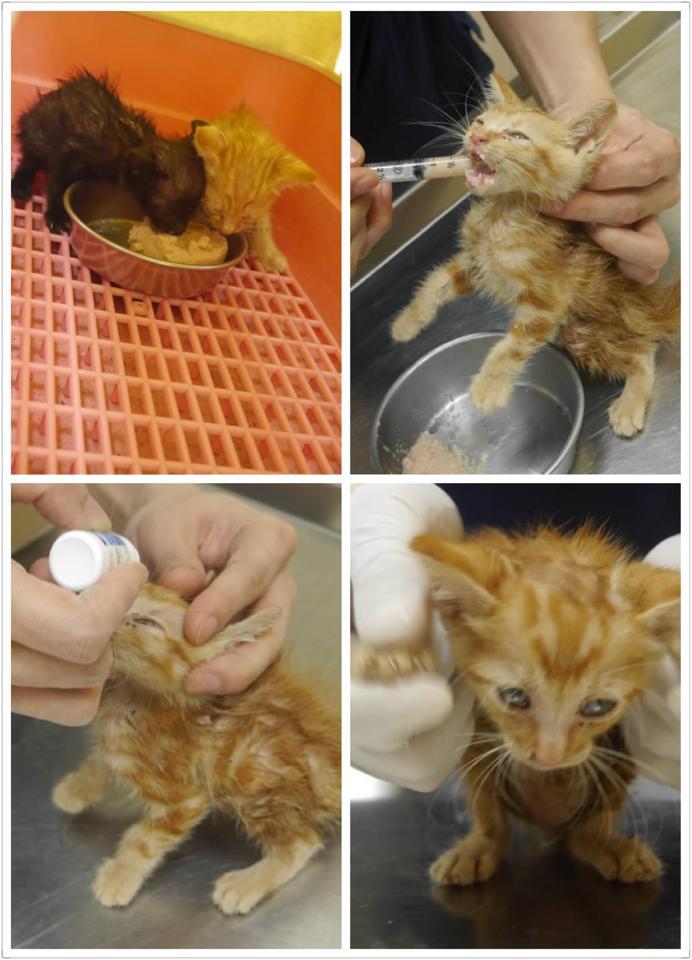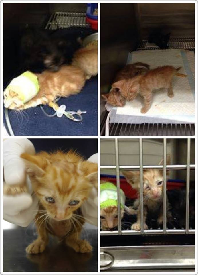 覺得他們可以有更美好的貓生,所以就拜託貓友幫忙一起去將三小貓帶下,誰知道隔天中秋節新店收容所也休息,延誤到今天才去將貓咪帶出,一下山就馬上衝去醫院,貓咪們都嚴重脫水,還有一小橘貓狀況不是很好(不會自己吃,需灌食)已上點滴,希望能平安渡過,小黑貓則是皮膚黴菌嚴重,頭頂都沒什麼毛,三小孩都感冒鼻塞,外加拉血便,但另小橘還好肯自行吃飯,驗貓瘟都過關,但為求謹慎,還是得小心照料才行。