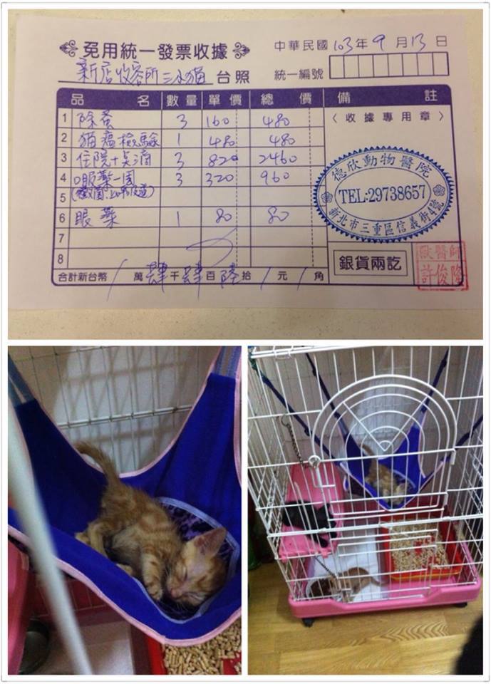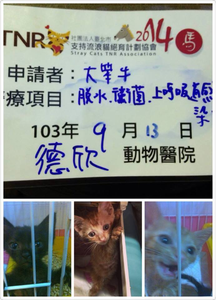 主題: 新店收容所救出的上呼吸道感染加嚴重脫水的小貓們 申請者姓名: 大笨牛 花色: 申請日期: 2014-09-16 19:54:30 申請者部落格: 申請者臉書網址: https://www.facebook.com/profile.php?id=1489838064 所在縣市/合作醫院: 新北市/德欣動物醫院 治療費用: 4460元 需求人數: 6人 已結案 (2014-11-12 11:55:17) 報名人員: Martin Chen(已付款)、水澐歆 x2(已付款)、Puffy(已付款)、邱惠卿 x2(已付款)、 候補人員: 動物病情說明: 中秋節前天看到新店收容所進了三隻小貓