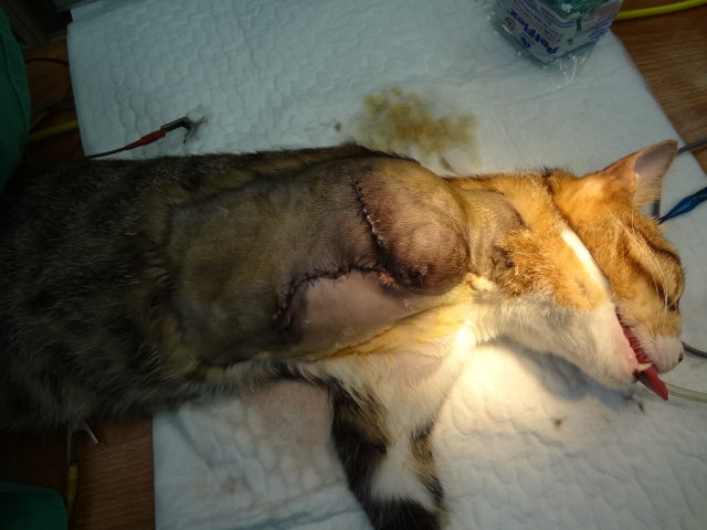 中秋前夕騎車到住家附近的商家採買東西,偶遇這隻不知打哪來的親人TNR公貓。右前肢已經無法支撐著地,右手掌變形且多處已磨破皮的在街頭行走,看來已有ㄧ些時日了,見路人喵喵叫且翻滾示好,實在令人心酸淚流,也不知這是如何造成的殘缺,我想幫助他就醫所以飛衝回車庫拿著外出籠去將他抓起來。希望大家幫幫他,既是讓我遇到了,醫治後我會中途他,若送養不出我會照顧他ㄧ生免於顛沛流離地再流浪。動物近況說明: 貓咪在家暫時關籠照顧 由於還在練習平衡感還有避免過度拉扯而影響傷口復原~ 等過幾天拆線後的表面小結痂都掉乾淨也無破皮時,就可以拆頭套和放出來自由自在活動.目前還有兩週的消炎藥要吃完 就完全沒問題了~因為心疼貓咪際遇也是有緣相遇~貓咪非常乖巧又親人 將來考慮長期居家照顧~