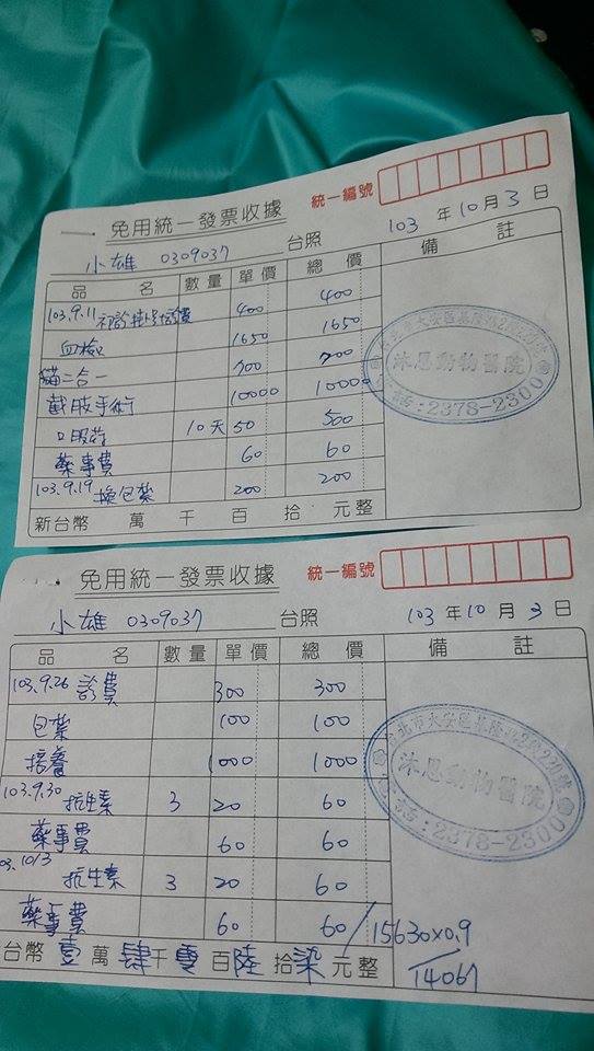 主題: 沿街乞食的親人跛腳TNR公貓 申請者姓名: 楊溫蒂 花色: 申請日期: 2014-10-04 17:33:35 申請者部落格: 申請者臉書網址: 所在縣市/合作醫院: 台北市/沐恩動物醫院 治療費用: 14067元 需求人數: 17人 已結案 (2014-11-12 11:55:11) 報名人員: Juli Cheng(已付款)、Chelcy(已付款)、Chelcy、徐雅嬪(已付款)、Shirley Tsai(已付款)、Annie Chen(已付款)、Luis(已付款)、Luis(已付款)、阿屁(已付款)、黃儀婷 x3(已付款)、林維甄(已付款)、Prince Chen(已付款)、宓殊(已付款)、林小豬(已付款)、Ellen Cheng(已付款)、愛台灣的香港人 =)(已付款)、 候補人員: 動物病情說明: {延街乞食的親人跛腳TNR公貓}