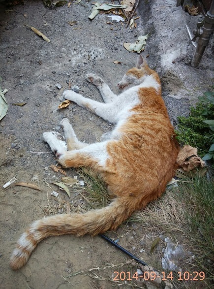 這隻貓昨天晚上躺在我家附近,一動也不動,有微弱呼吸。他很瘦,攤在地上,無法走動,四足有些僵硬但又軟趴趴無力。也不太會回應。