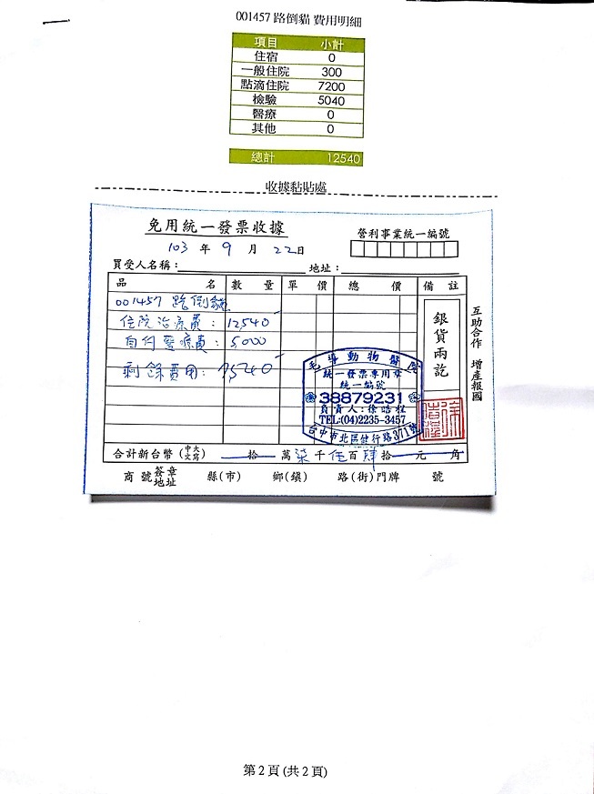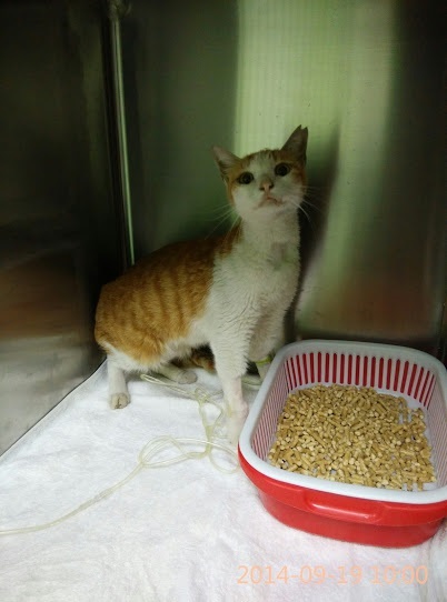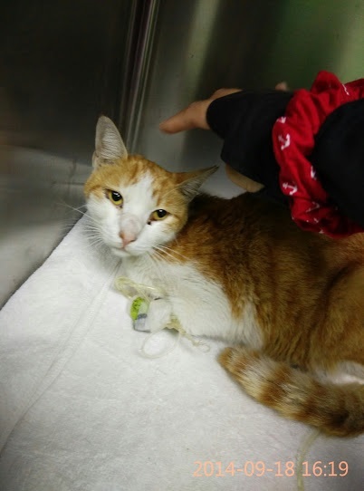 20140916/醫生表示這隻貓咪長期處於脫水、營養不良的情況,肌肉萎縮情況嚴重,貓咪腎功能指數也很高。接下來要看是否腎功能指數能下降。