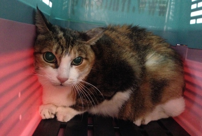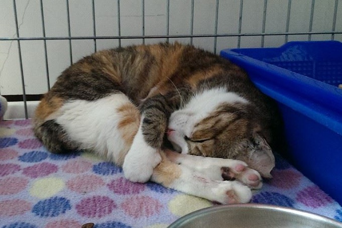 2014年初,天空腋下兩側開始出現疝氣狀況,但已動過5次手術的她已不再合適麻醉。以前在路上吃不好受苦、現在安置協會卻為病痛所苦,若不能在治療上提供更好的幫助,就靜靜的陪伴她吧!不強迫她吃藥,並盡量給她吃喜愛的湯罐與小餅乾,讓個性緊張、怕人的天空,可以好好享受最後時光。