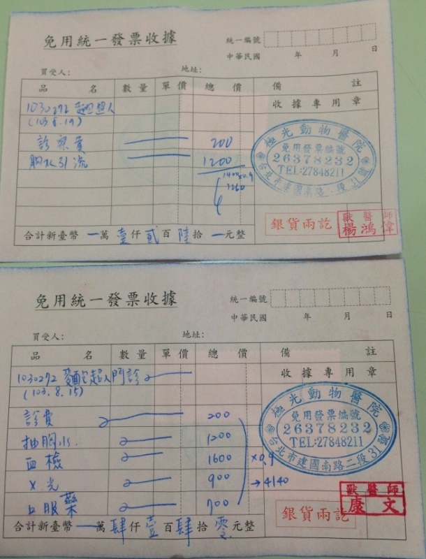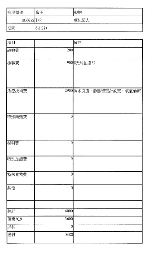 主題: 肺氣腫呼吸急促的麵包超人 申請者姓名: 臺北市支持流浪貓絕育計劃協會 花色: 申請日期: 2014-09-24 17:32:29 申請者部落格: 申請者臉書網址: 所在縣市/合作醫院: 台北市/極光動物醫院 治療費用: 9000元 需求人數: 10人 已結案 (2015-02-24 12:26:10) 報名人員: Mindy Kan(已付款)、Mindy Kan(已付款)、Penny Ko(已付款)、如絲(已付款)、Sunny Chen(已付款)、cafeyi(已付款)、orange(已付款)、Yen-Yuan Wang(已付款)、Anita Yin x2(已付款)、 候補人員: 動物病情說明: 準備印製桌曆時,麵麵已進入病危狀態。