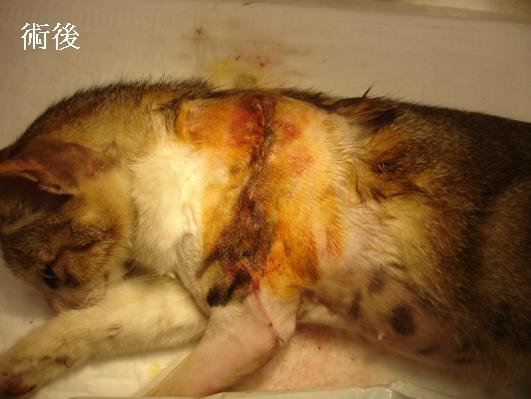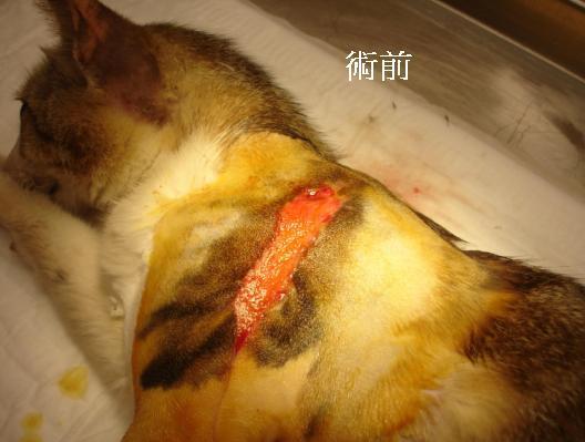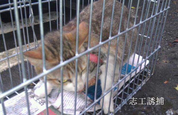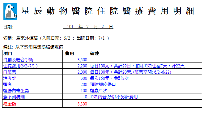 醫師研判此貓應該之前曾受傷而且已處理過,然後回置於路邊,可能因某些外力導致傷口裂開. 進行縫合手術,經過3週休養傷口已完全癒合. 因為這隻母貓尚未結紮,所以於6/23結紮. 休養1週後於7/1將貓咪帶回烏來原地野放.