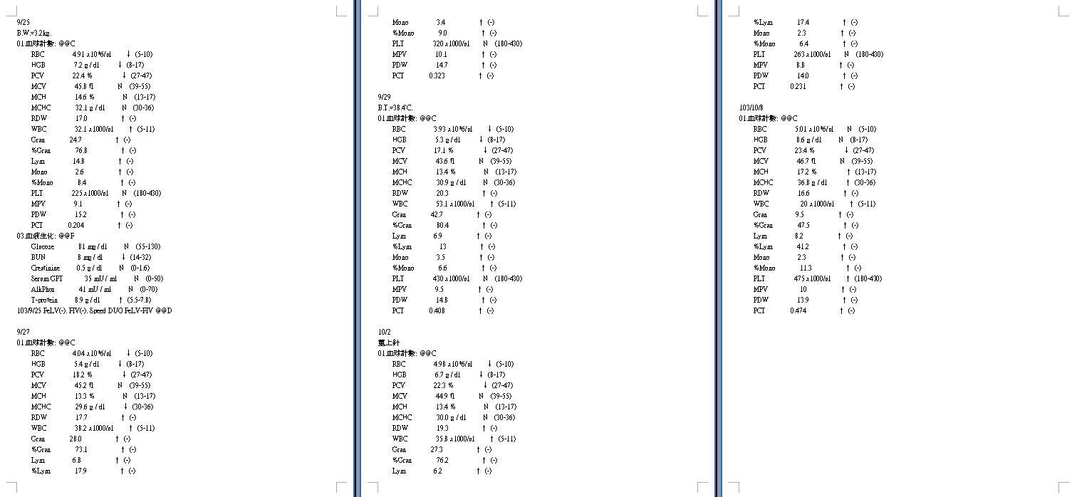 發現有貧血狀況、白血球指數過高、但沒有貓愛滋