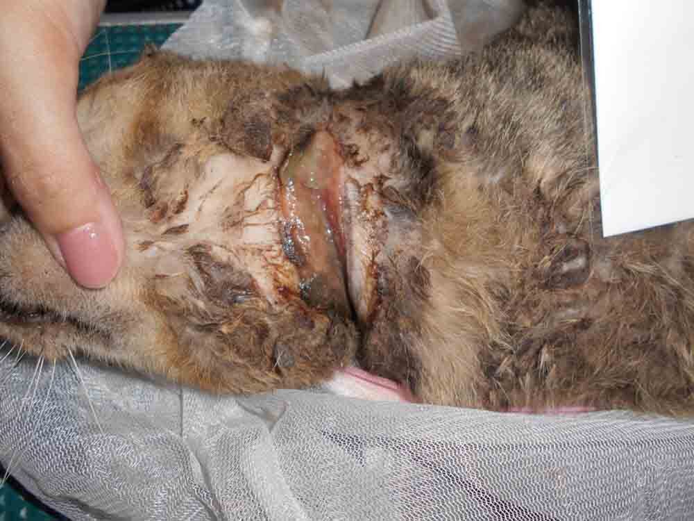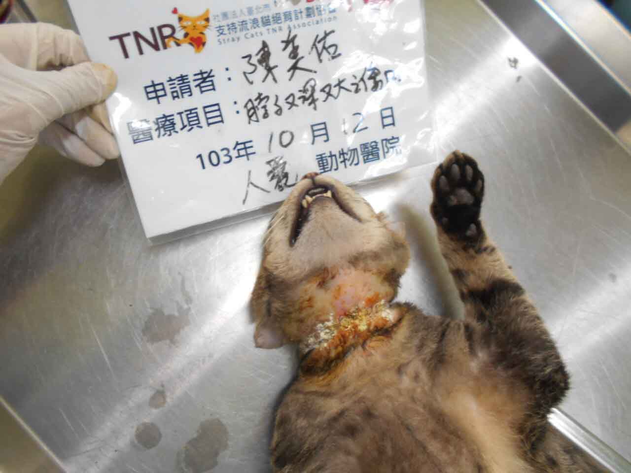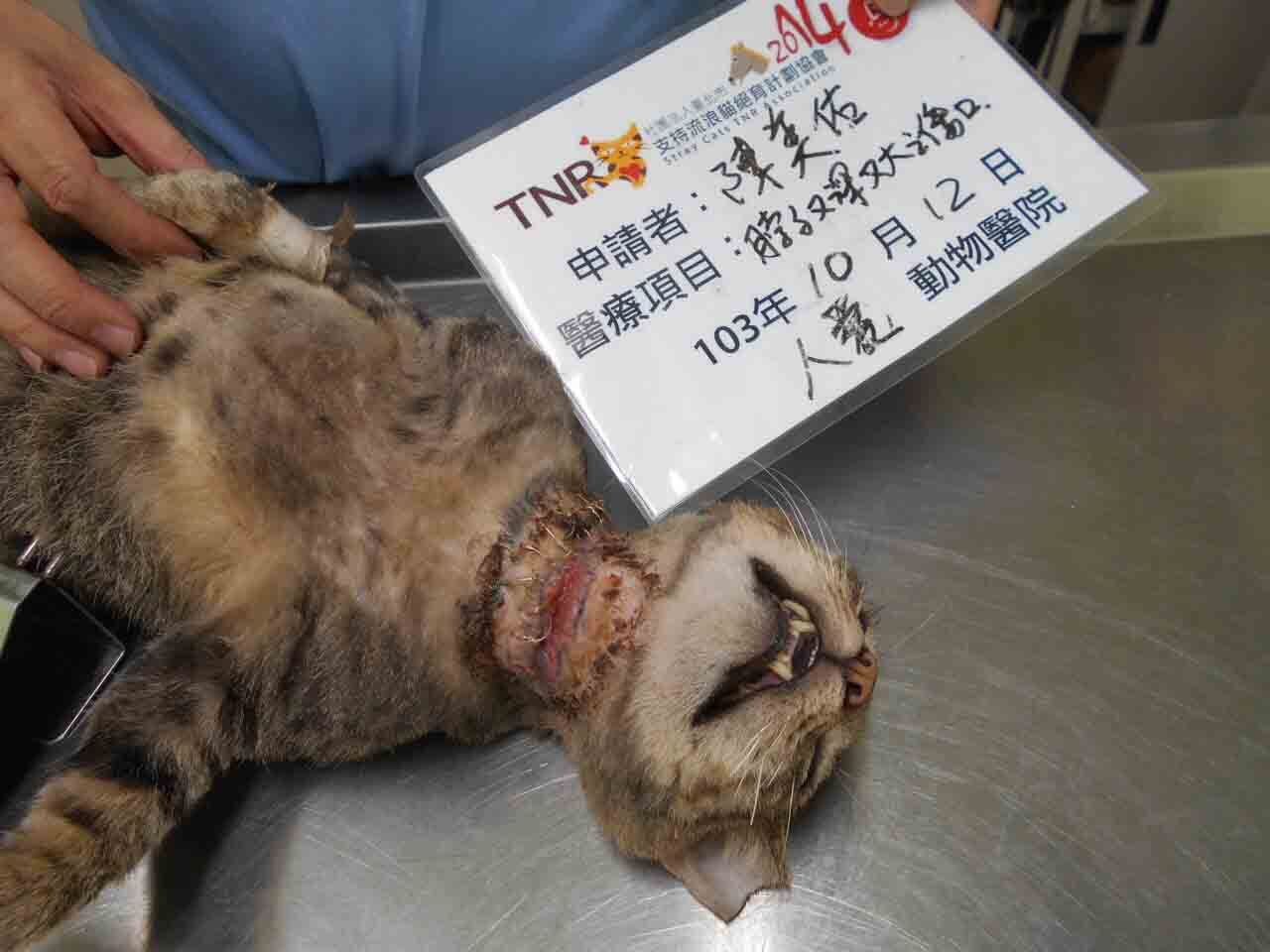 貓咪脖子這個傷口又寬又深,有潰爛.發生原因不明.需緊急麻醉,清理傷口並縫合.