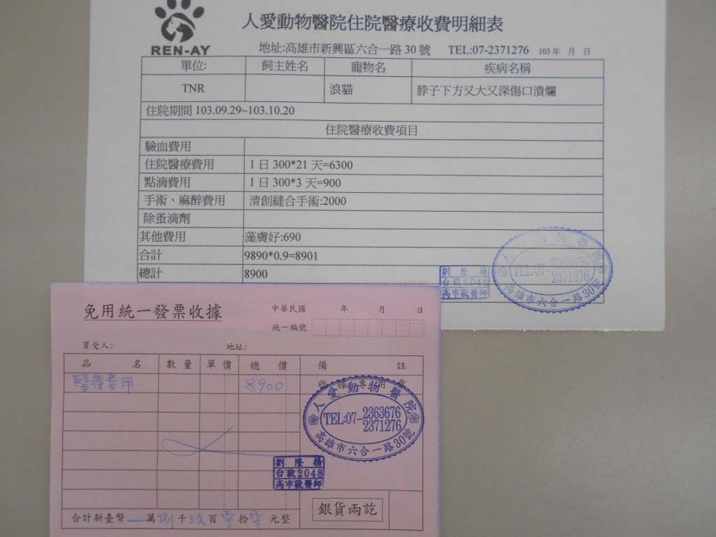 總計:9890*0.9=8900元.動物近況說明: 貓咪昨日10/20已出院接回,傷口恢復狀況不錯,目前暫留置家中照顧上藥膏,預計至傷口痊癒後,再放回.