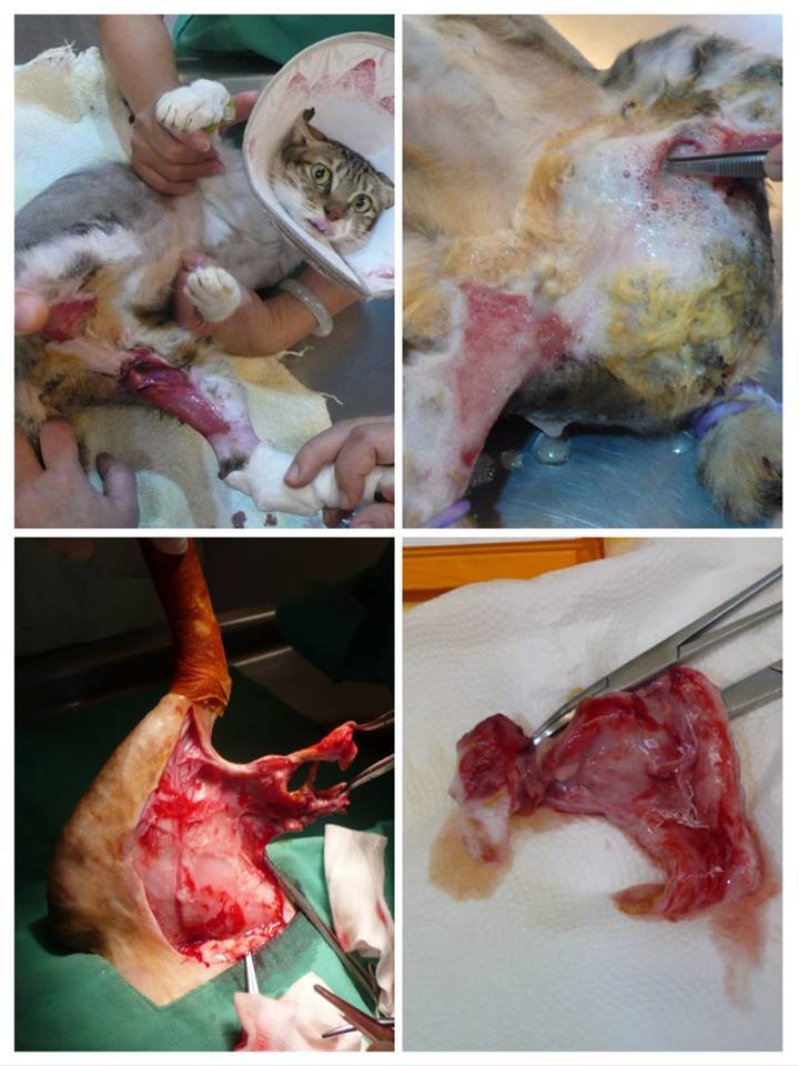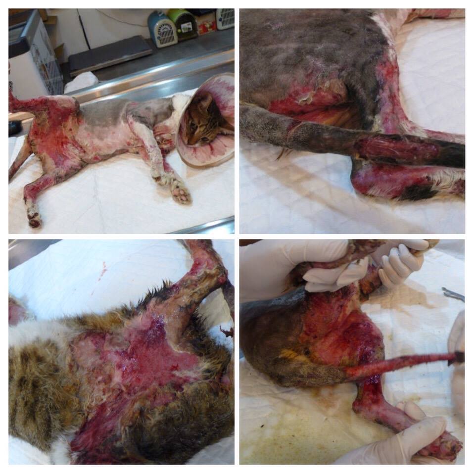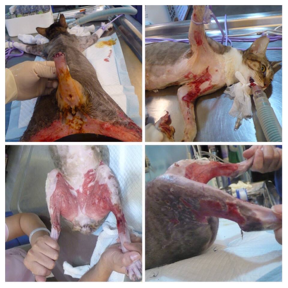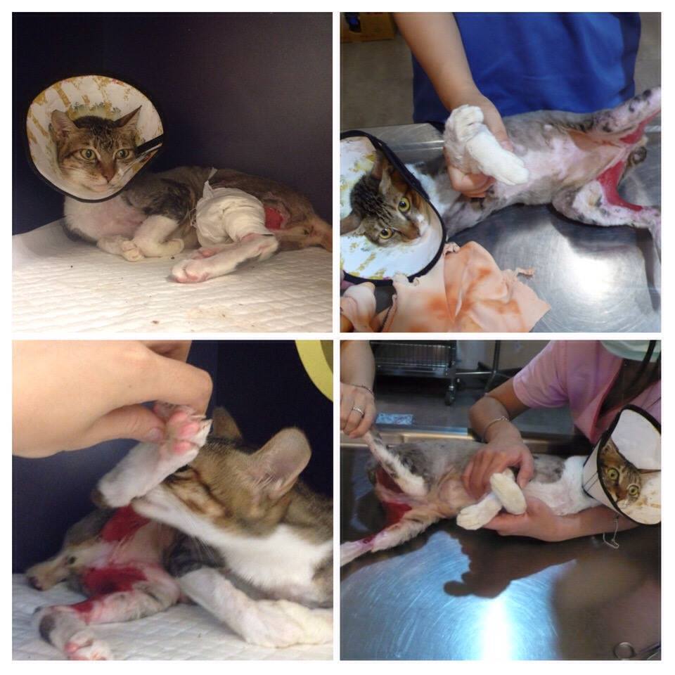 傷口面積很大,四肢,尾巴,尤其下腹部。醫生開藥,教我如何照顧傷口。很吃力但當時我也不知道有什麼其他方法。