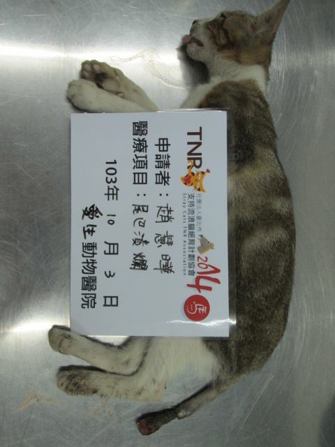 主題: 救援屏東萬丹7-11尾巴受傷貓 申請者姓名: 趙慧曄 花色: 申請日期: 2014-10-20 17:44:06 申請者部落格: 申請者臉書網址: 所在縣市/合作醫院: 屏東縣/愛生動物醫院 治療費用: 4900元 需求人數: 6人 已結案 (2015-02-24 12:25:14) 報名人員: 黃小資(已付款)、鮑宣聿、連水安(已付款)、Pinger x3(已付款)、fnnny(已付款)、 候補人員: 動物病情說明: 這是通報人江小姐通報萬丹鄉7-11前的尾巴受傷的貓咪!!經由誘捕已送至特約醫院救治醫療!!傷口已經一陣子~當天緊急開刀截斷!!現在在醫院住院醫療~由於開刀流血很多所以結紮部分等傷口穩定再手術!! 動物近況說明: 貓咪在醫院細心照顧下恢復的很好!!食慾也很好!!治療出院後會原地原放喔!!謝謝大家愛心的幫忙!!謝謝!!