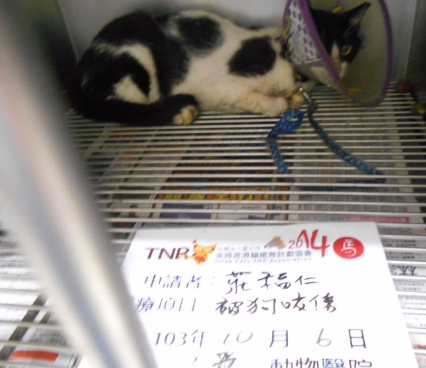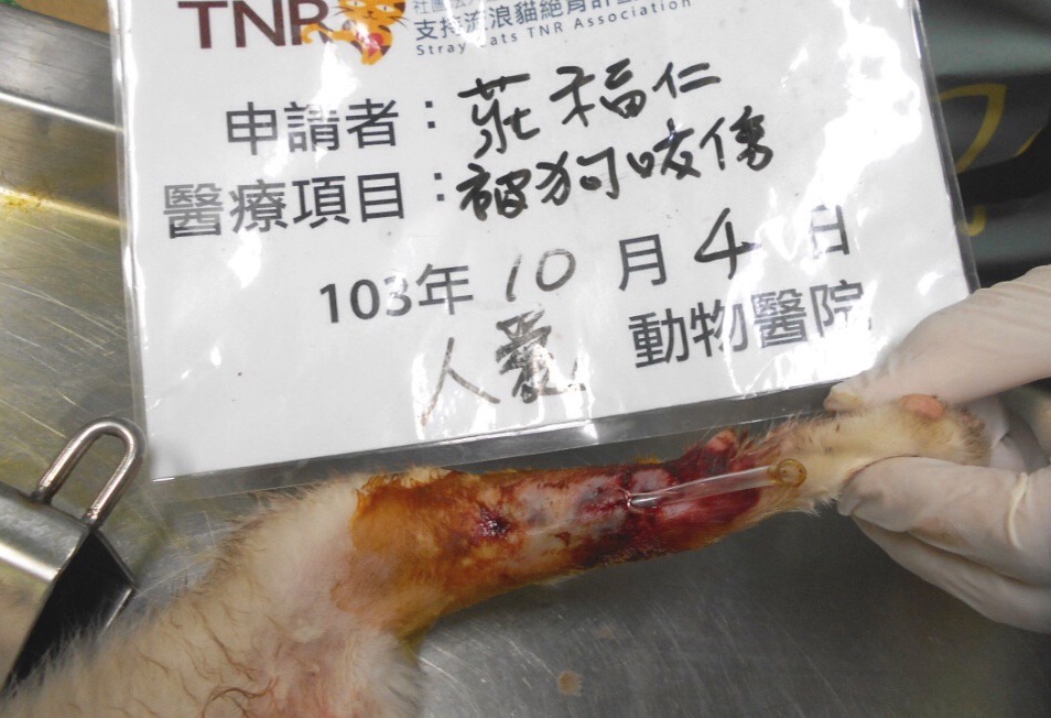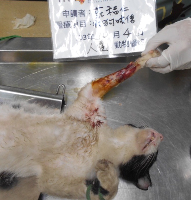主題: 賓士公貓助紮,右前腳有被狗咬的潰瘍傷口急需切開引流 申請者姓名: 莊福仁 花色: 申請日期: 2014-10-09 19:03:59 申請者部落格: 申請者臉書網址: 所在縣市/合作醫院: 高雄市/人愛動物醫院 治療費用: 3600元 需求人數: 9人 已結案 (2015-02-24 12:25:03) 報名人員: Vicky Huang x9(已付款)、 候補人員: 動物病情說明: 志工餵食地區之一青島街 ,有一隻賓士公貓在半個月前便發現行走時,右前腳呈現跛腳 腫脹和傷口,經過抗生素口服藥物投予多日後,仍未改善,志工便誘捕結紮並請醫師協助檢查傷口。送醫院助紮及檢查右前腳~經過醫生檢查發現右前隻疑似被狗傷咬已造成內部肌肉組織潰爛~建議需麻醉手術裝置引流管~若此傷口沒有及時處理,再感染下去恐造成截肢~