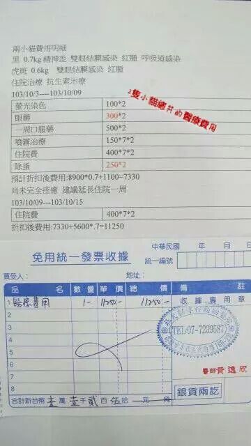 照片上最後收據是2隻小貓加起來的全部醫療費用