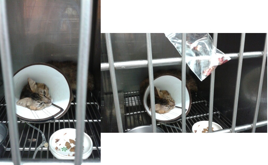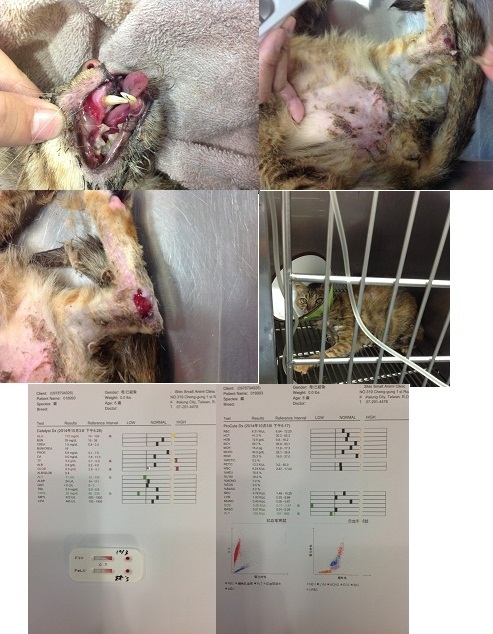 到院後即驗貓愛滋及抽血檢查,確定為愛滋貓,幸好肝腎指數都正常,醫生研判是愛滋發作,導致口炎、牙齦潰瘍十分嚴重,身體也有好幾個傷口,感覺是舊傷卻好不完全的樣子。